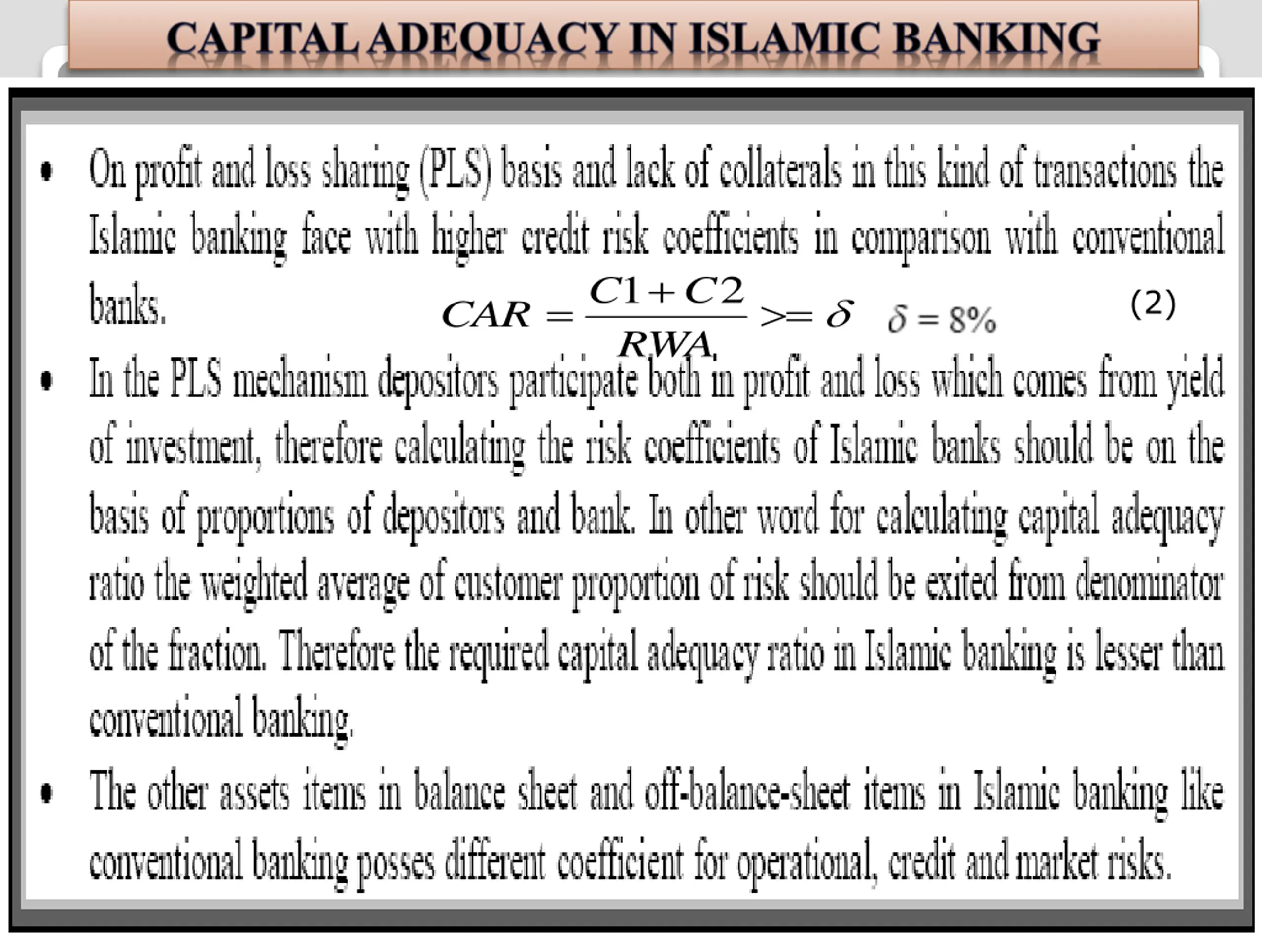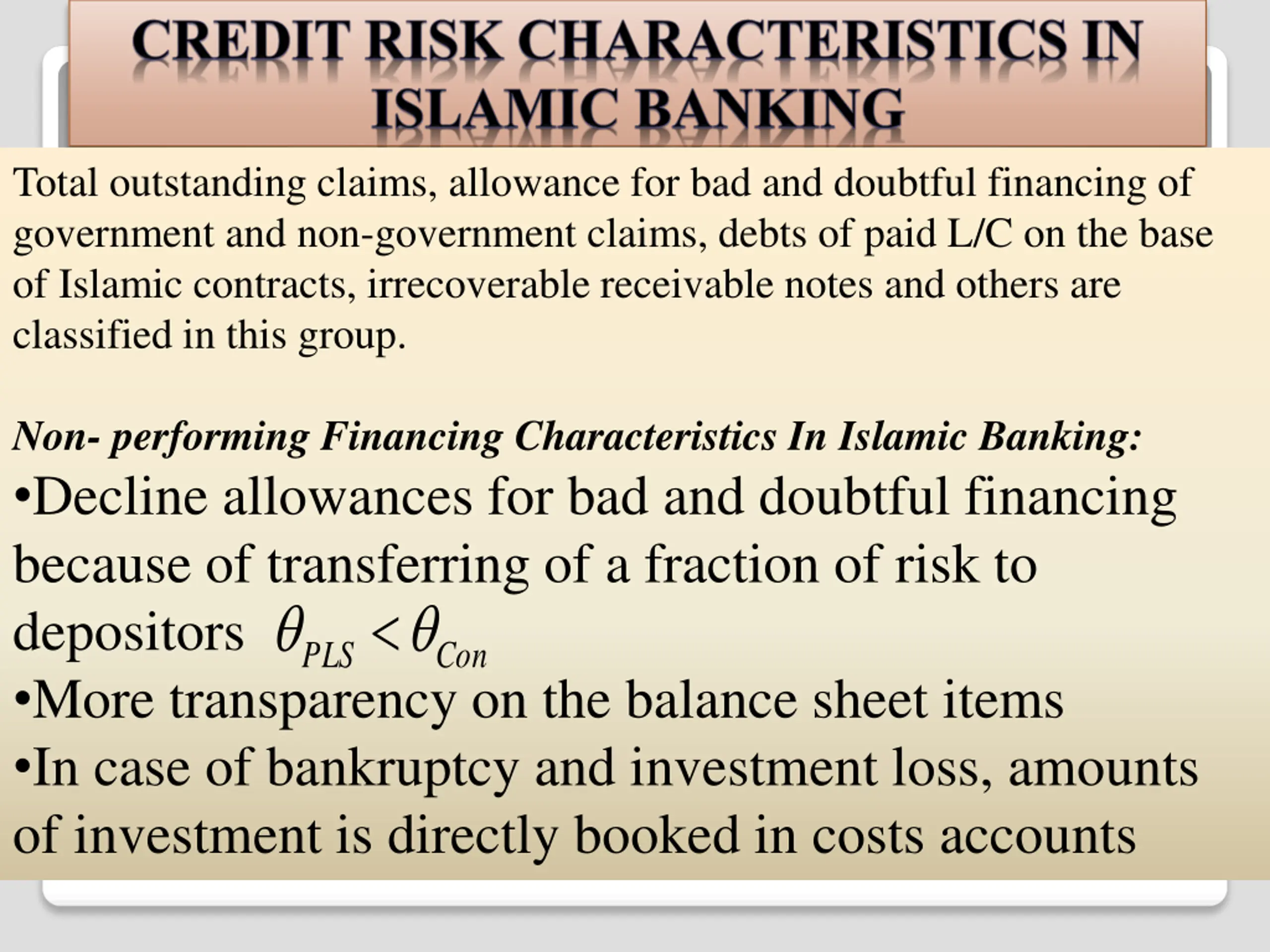 Total outstanding claims, allowance for bad and doubtful financing of government and non-government claims, debts of paid L/C on the base of Islamic contracts, irrecoverable receivable notes and others are classified in this group. Non- performing Financing Characteristics In Islamic Banking: Decline allowances for bad and doubtful financing because of transferring of a fraction of risk to depositors More transparency on the balance sheet items In case of bankruptcy and investment loss, amounts of investment is directly booked in costs accounts PLS Con