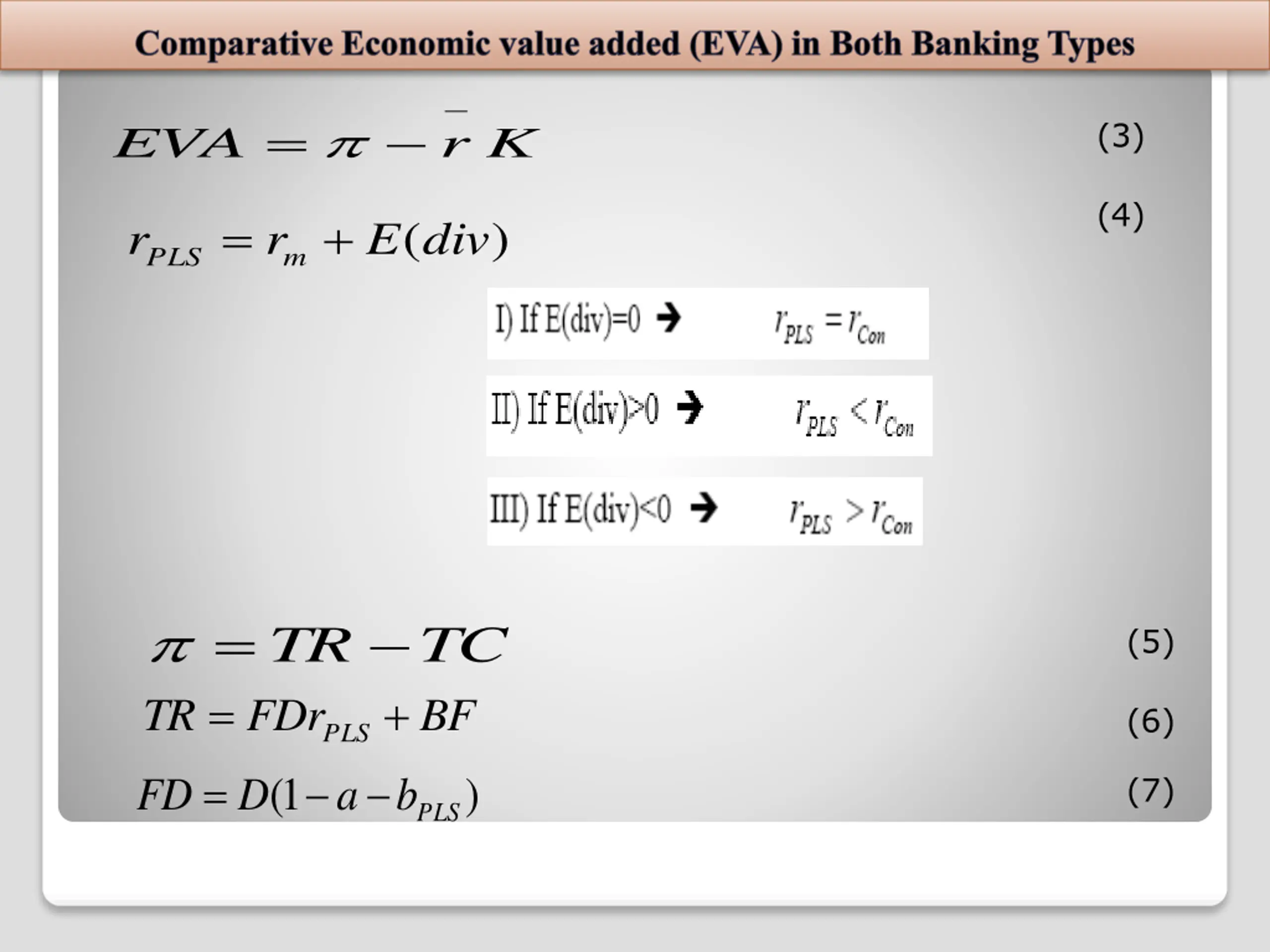 Since provident reserve in PLS banking is lesser than conventional banking so financial efficiency in PLS banking is more than conventional banking. The main reason of more efficiency is due to stability in cash flows of PLS banking; so for covering liquidity risk less provident funds are required in comparison with conventional banking. Lack of outstanding claims and doubtful claims in PLS banking because of nature of Musharakah contracts and supervision on investments decline coefficient in Islamic banking in comparison to conventional banking. Hence lack of this kind of inefficient assets will improve financial circulations in PLS banking than conventional banking and this will grow up the EVA in this kind of banking system. Rate of return in PLS banking is more than the conventional banking, so consequently EVA in PLS banking is higher than conventional banking. Con PLS r r PLS b Con b PLS Con