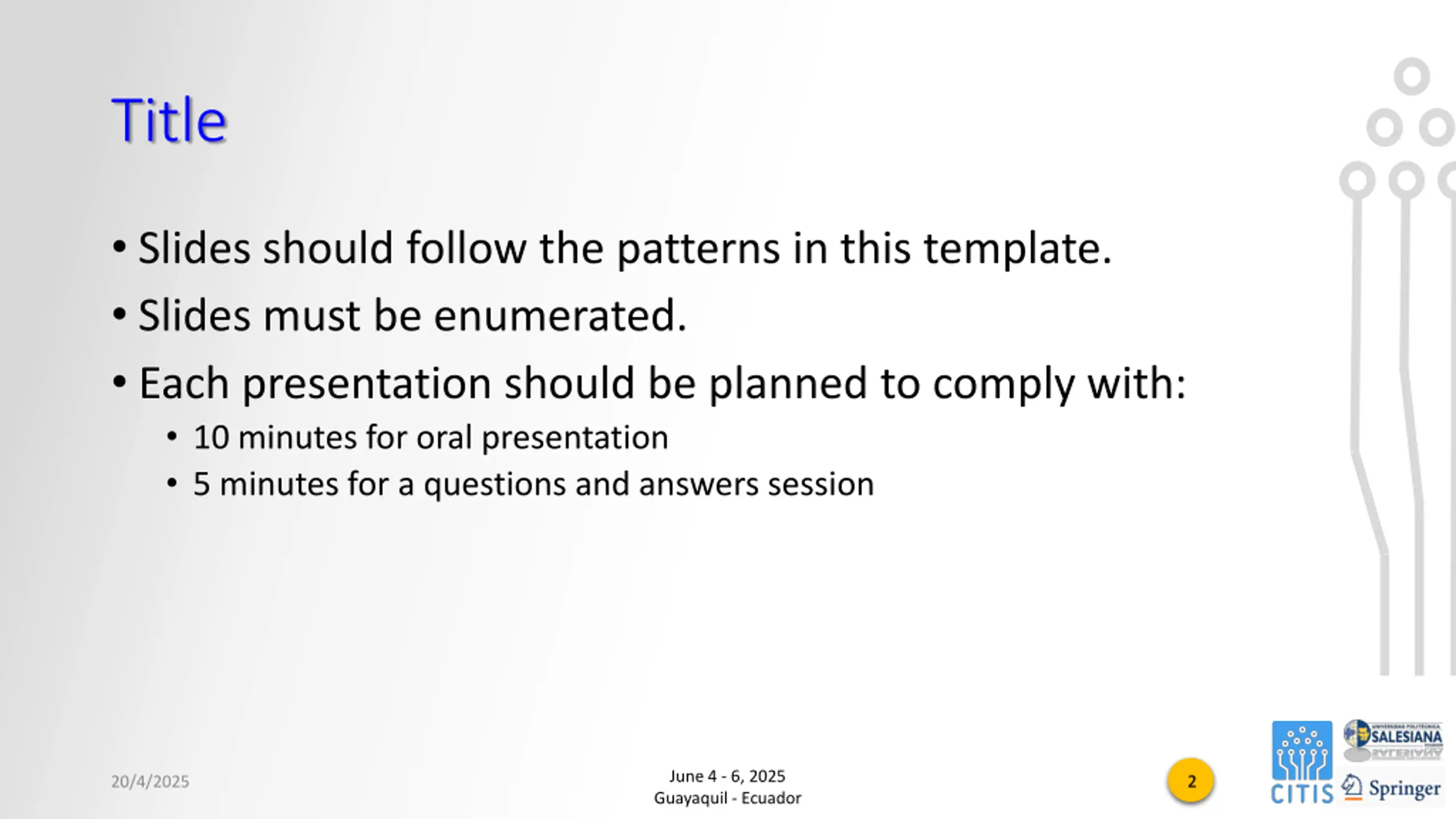 Title Slides should follow the patterns in this template. Slides must be enumerated. Each presentation should be planned to comply with: 10 minutes for oral presentation 5 minutes for a questions and answers session June 4 - 6, 2025 Guayaquil - Ecuador 20/4/2025 2