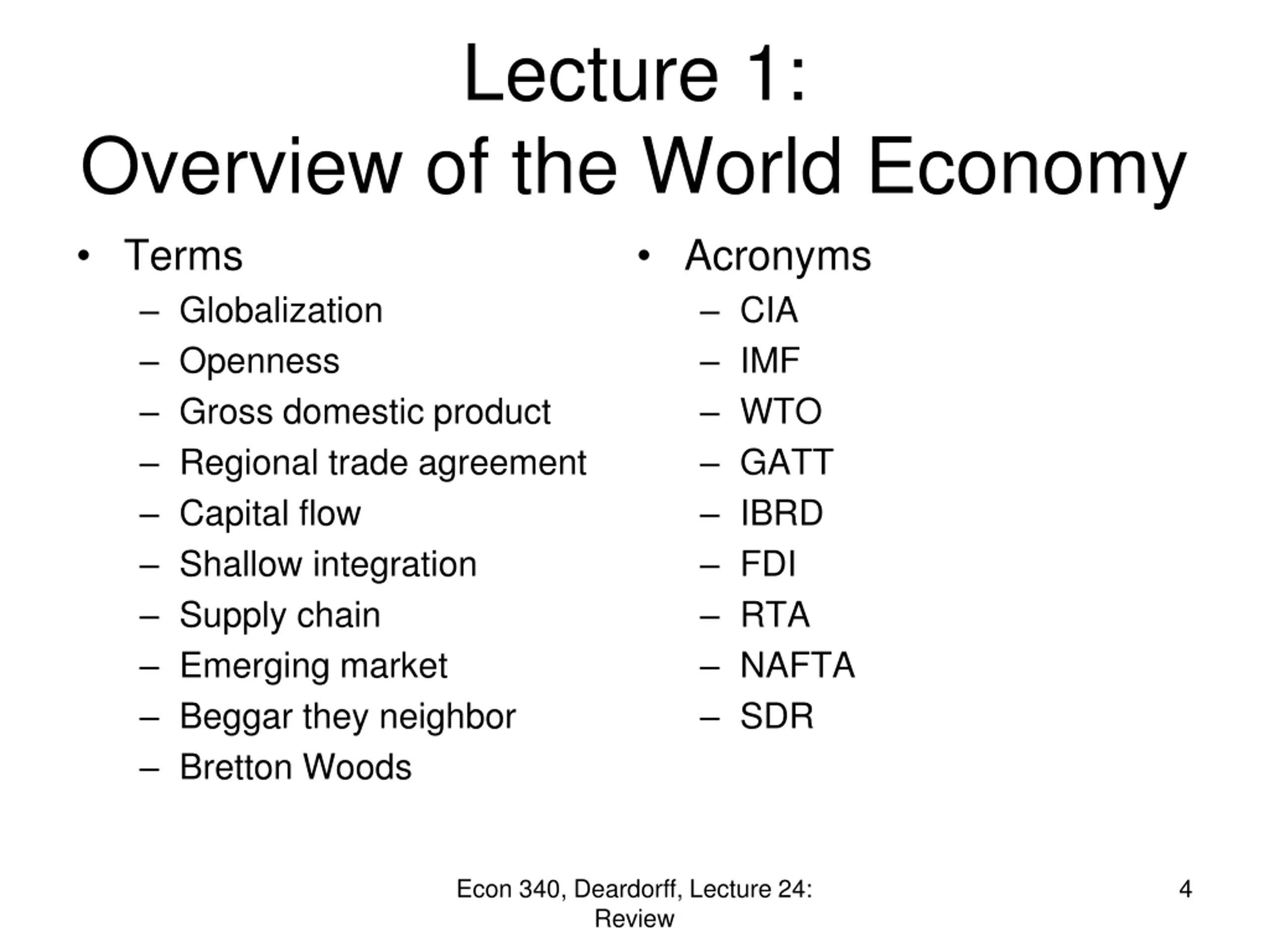 Lecture 1: Overview of the World Economy Terms Globalization Openness Gross domestic product Regional trade agreement Capital flow Shallow integration Supply chain Emerging market Beggar they neighbor Bretton Woods Acronyms CIA IMF WTO GATT IBRD FDI RTA NAFTA SDR Econ 340, Deardorff, Lecture 24: Review 4