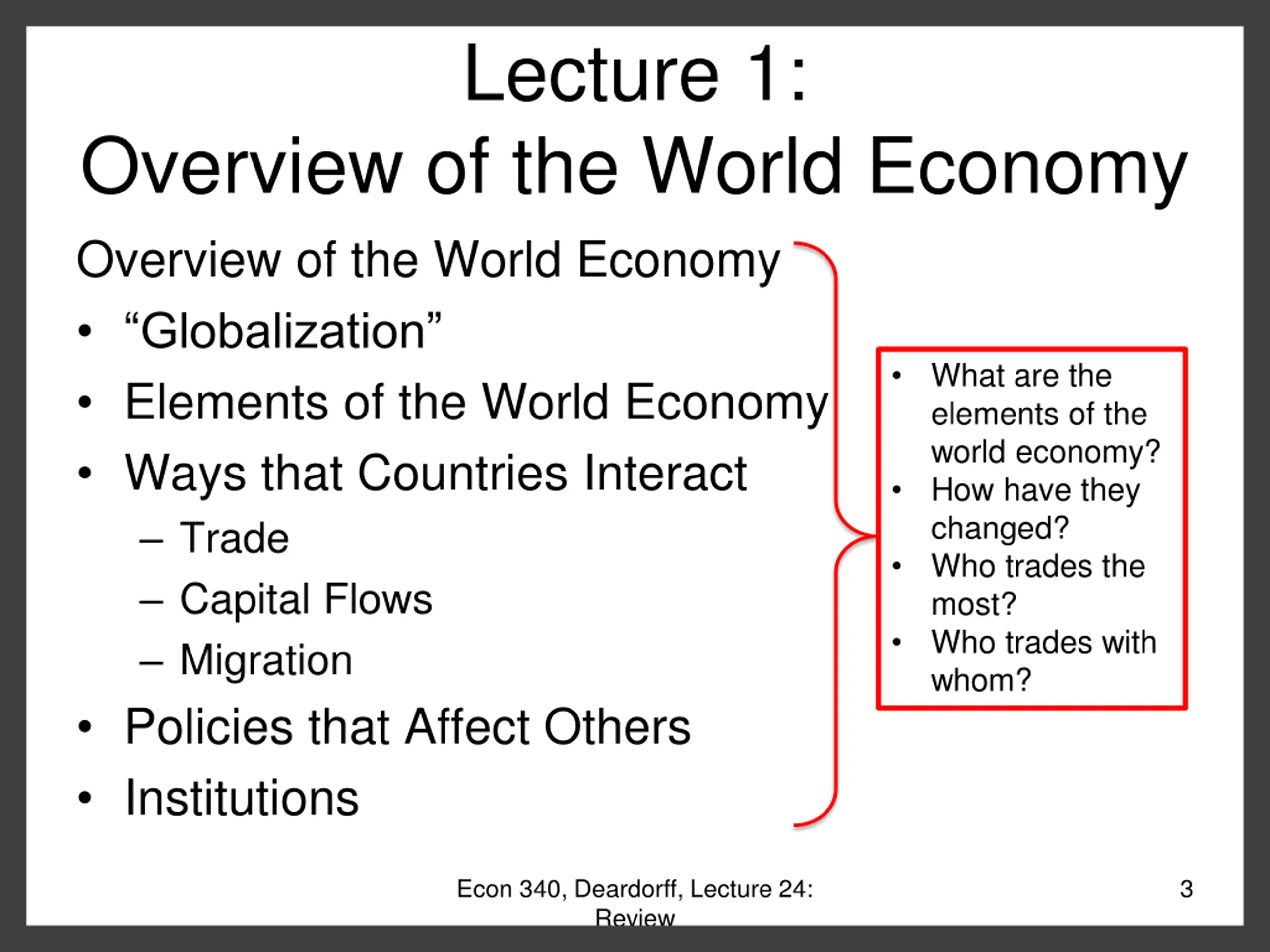 Lecture 1: Overview of the World Economy Overview of the World Economy Globalization Elements of the World Economy Ways that Countries Interact Trade Capital Flows Migration Policies that Affect Others Institutions What are the elements of the world economy? How have they changed? Who trades the most? Who trades with whom? Econ 340, Deardorff, Lecture 24: Review 3