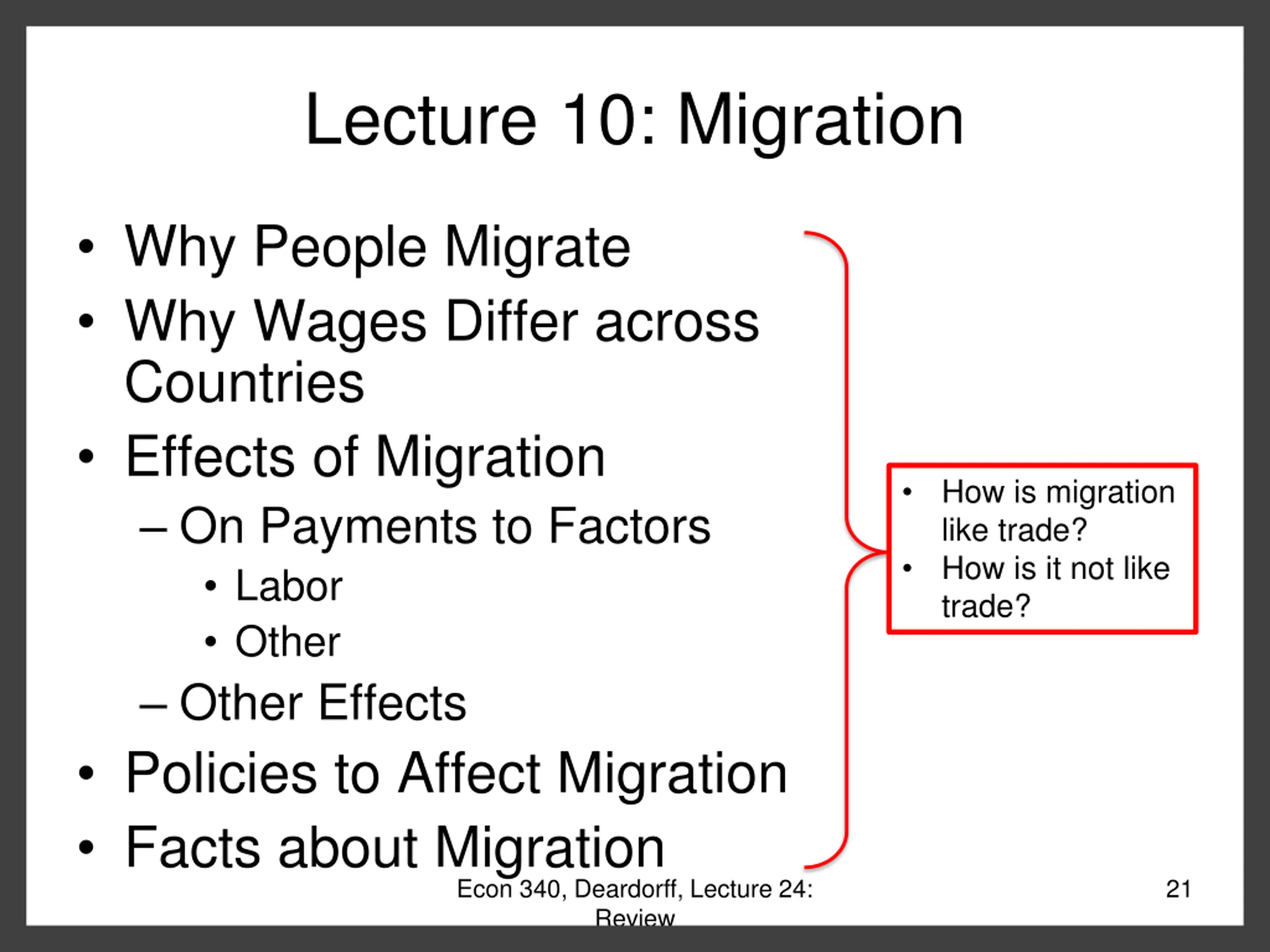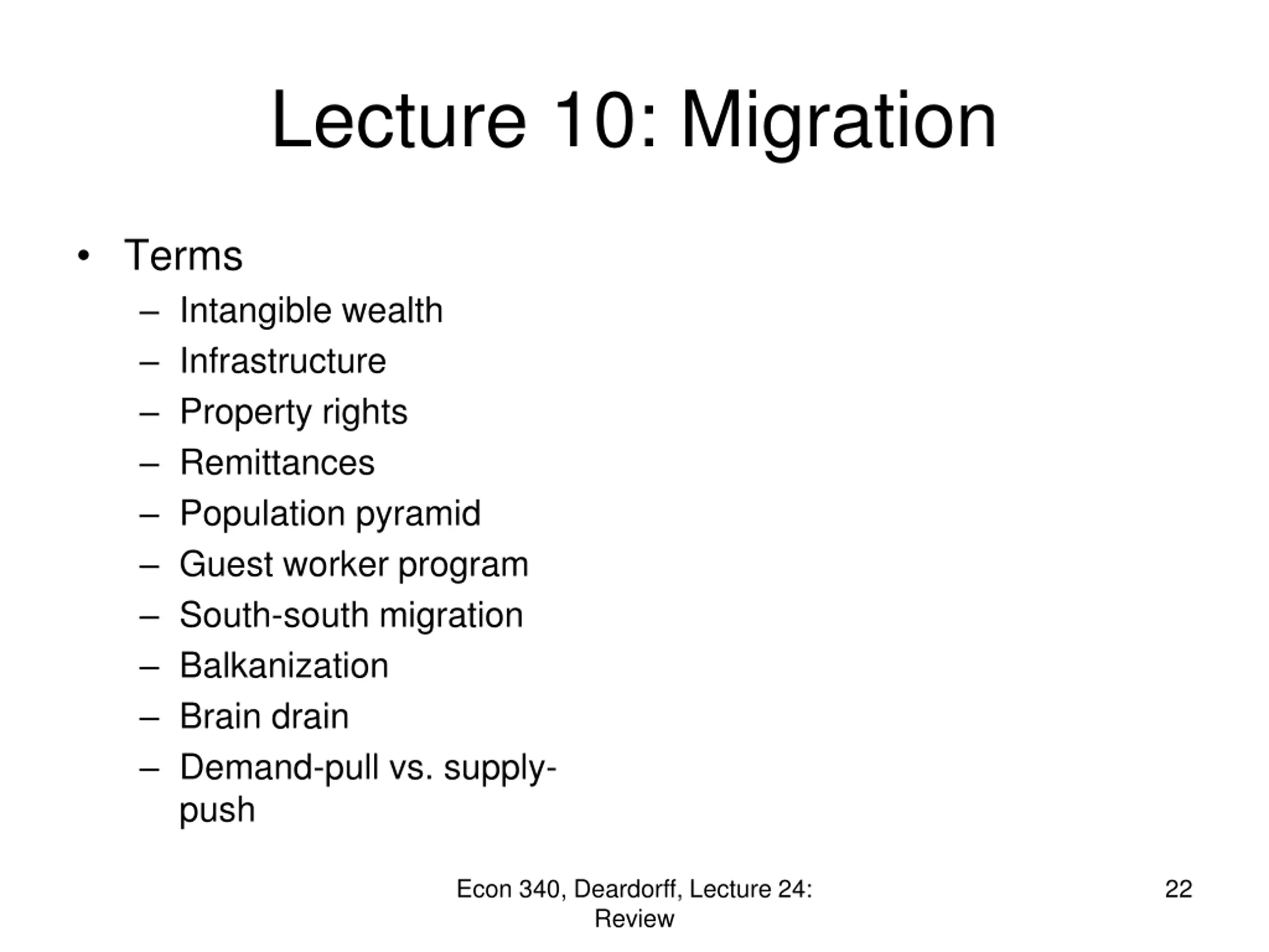 Lecture 10: Migration Terms Intangible wealth Infrastructure Property rights Remittances Population pyramid Guest worker program South-south migration Balkanization Brain drain Demand-pull vs. supply- push Econ 340, Deardorff, Lecture 24: Review 22
