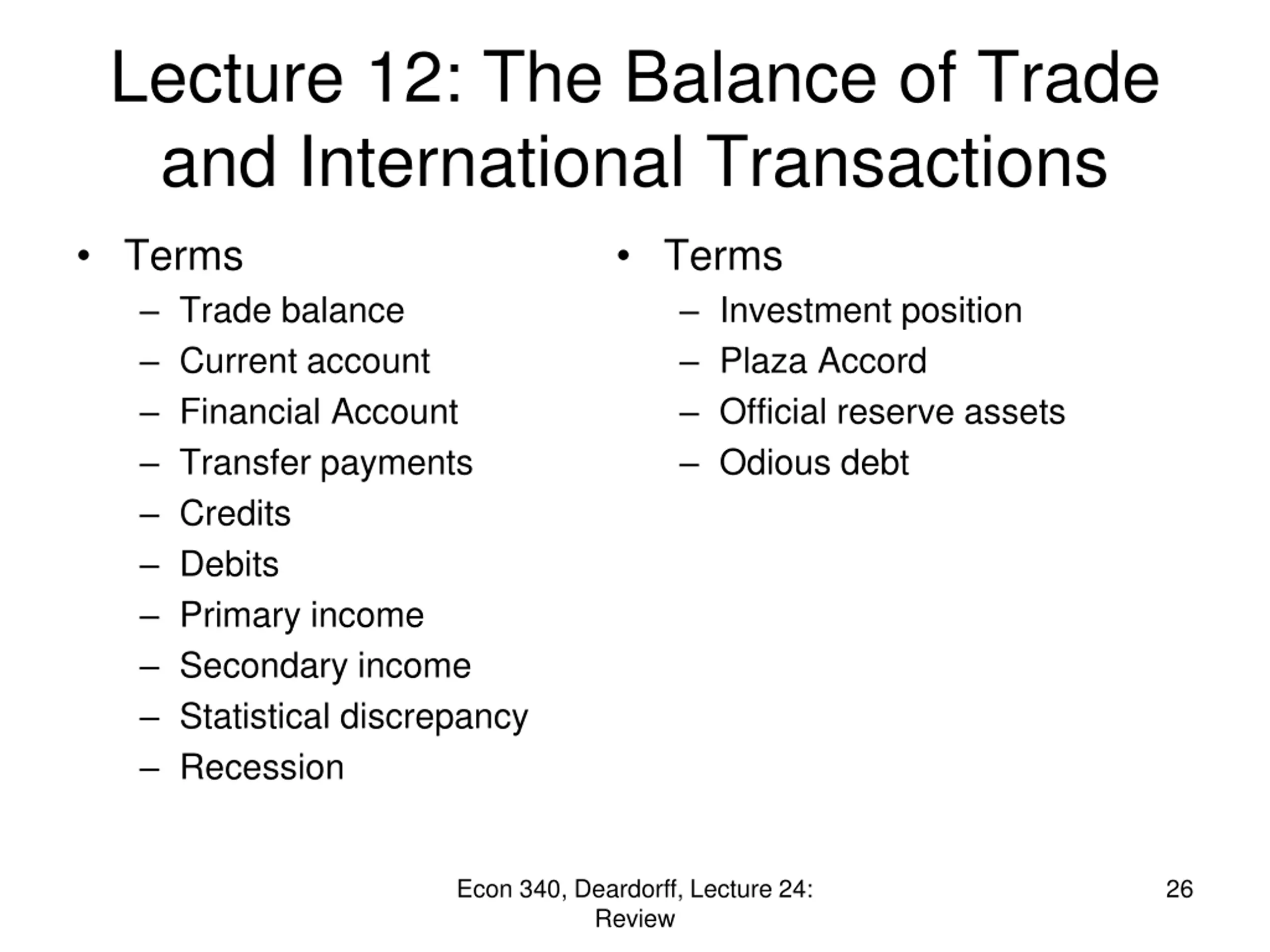 Lecture 12: The Balance of Trade and International Transactions Terms Trade balance Current account Financial Account Transfer payments Credits Debits Primary income Secondary income Statistical discrepancy Recession Terms Investment position Plaza Accord Official reserve assets Odious debt Econ 340, Deardorff, Lecture 24: Review 26