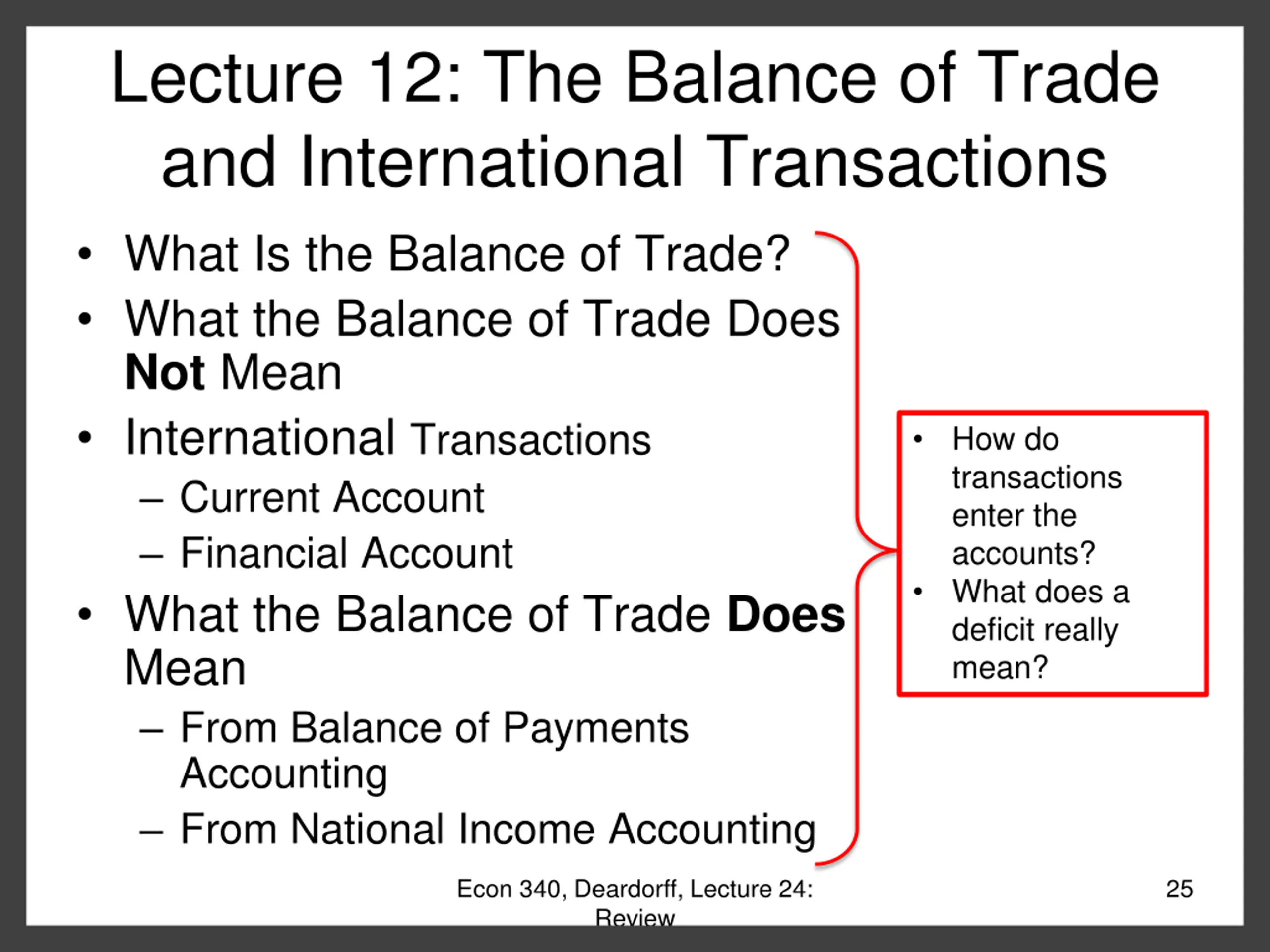 Lecture 12: The Balance of Trade and International Transactions What Is the Balance of Trade? What the Balance of Trade Does Not Mean International Transactions Current Account Financial Account What the Balance of Trade Does Mean From Balance of Payments Accounting From National Income Accounting How do transactions enter the accounts? What does a deficit really mean? Econ 340, Deardorff, Lecture 24: Review 25