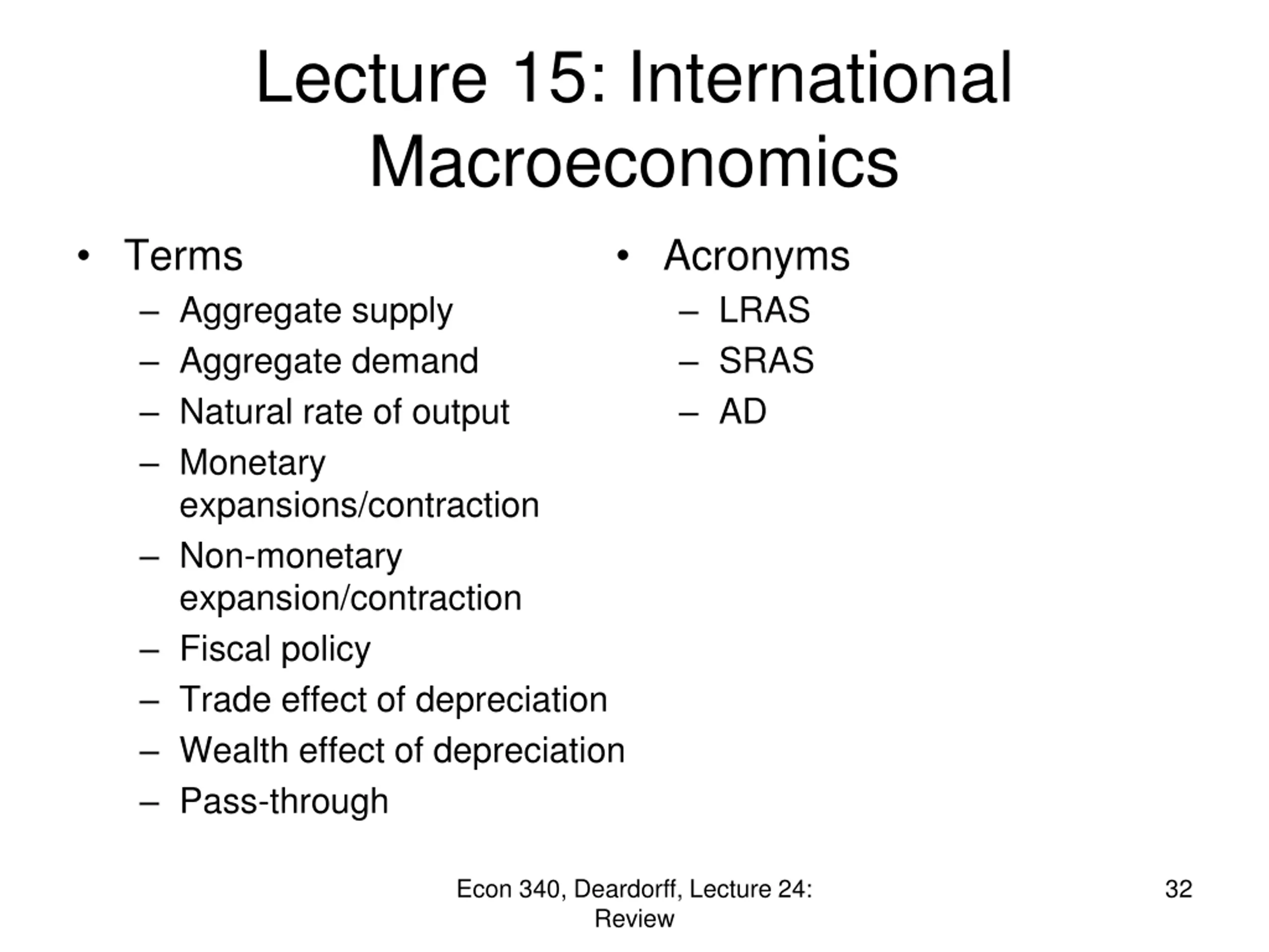Lecture 15: International Macroeconomics Terms Aggregate supply Aggregate demand Natural rate of output Monetary expansions/contraction Non-monetary expansion/contraction Fiscal policy Trade effect of depreciation Wealth effect of depreciation Pass-through Acronyms LRAS SRAS AD Econ 340, Deardorff, Lecture 24: Review 32