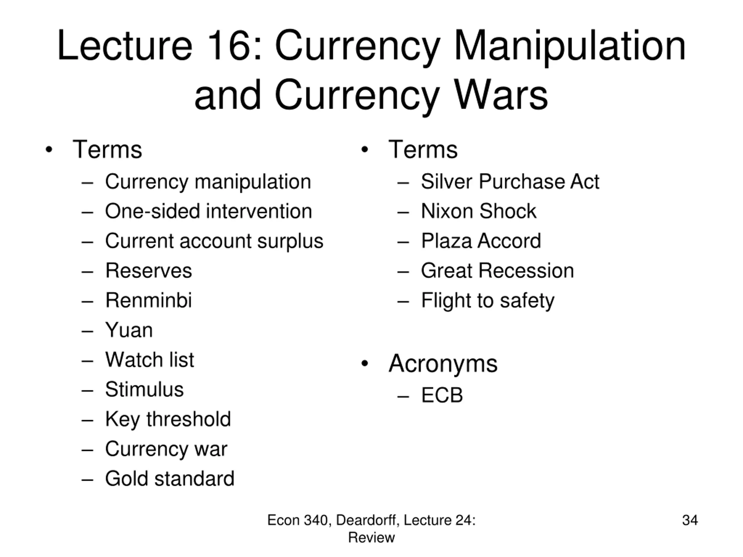 Lecture 16: Currency Manipulation and Currency Wars Terms Currency manipulation One-sided intervention Current account surplus Reserves Renminbi Yuan Watch list Stimulus Key threshold Currency war Gold standard Terms Silver Purchase Act Nixon Shock Plaza Accord Great Recession Flight to safety Acronyms ECB Econ 340, Deardorff, Lecture 24: Review 34