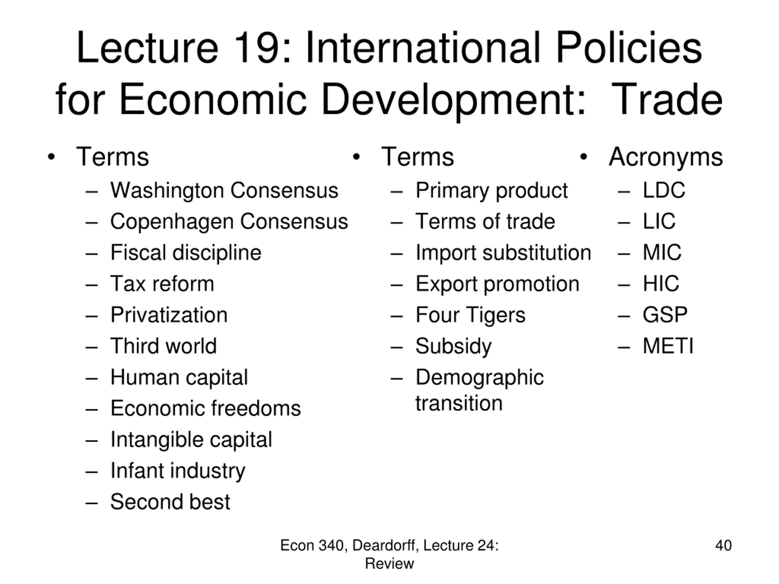 Lecture 19: International Policies for Economic Development: Trade Terms Washington Consensus Copenhagen Consensus Fiscal discipline Tax reform Privatization Third world Human capital Economic freedoms Intangible capital Infant industry Second best Terms Primary product Terms of trade Import substitution Export promotion Four Tigers Subsidy Demographic transition Acronyms LDC LIC MIC HIC GSP METI Econ 340, Deardorff, Lecture 24: Review 40
