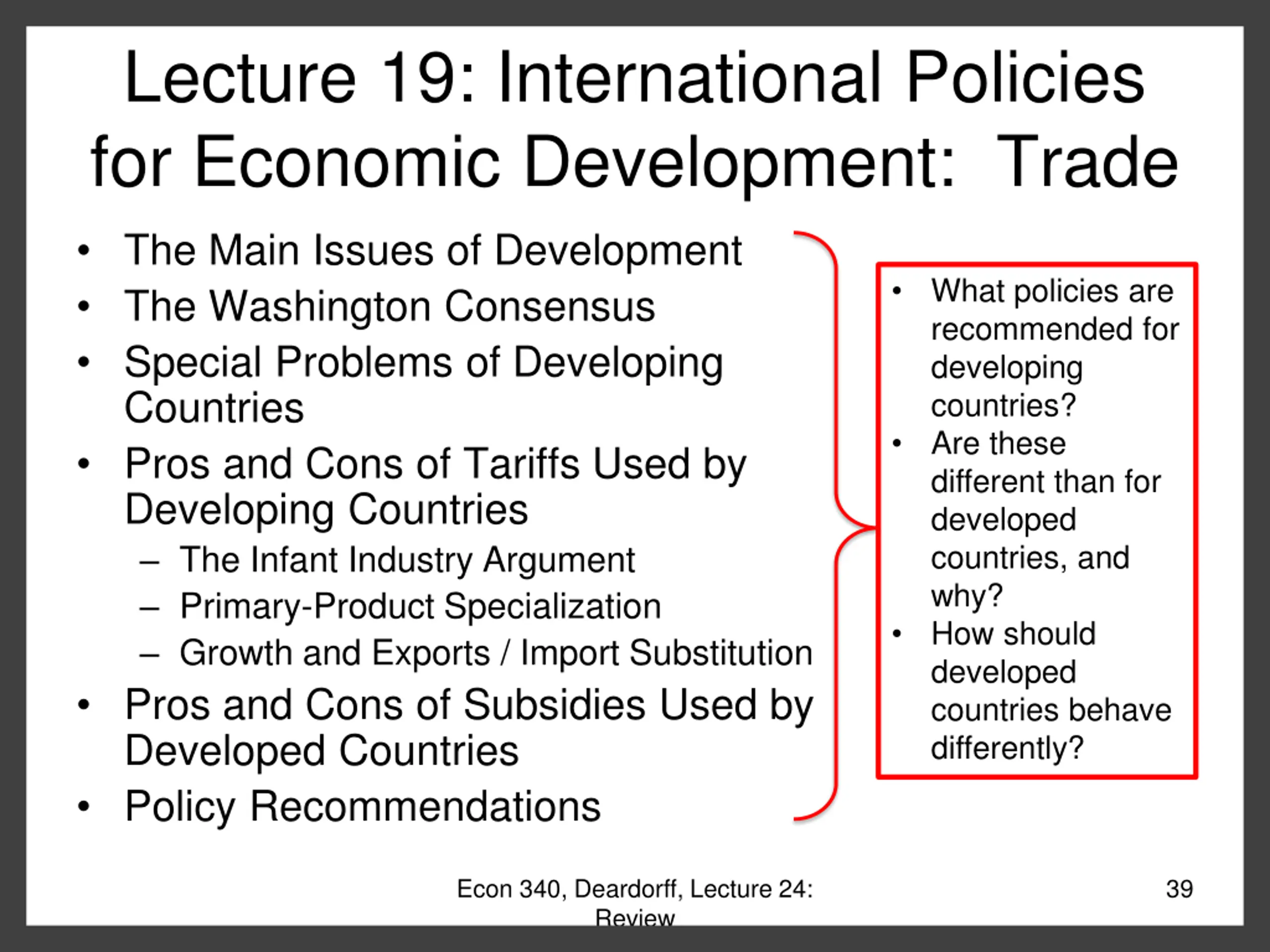 Lecture 19: International Policies for Economic Development: Trade The Main Issues of Development The Washington Consensus Special Problems of Developing Countries Pros and Cons of Tariffs Used by Developing Countries The Infant Industry Argument Primary-Product Specialization Growth and Exports / Import Substitution Pros and Cons of Subsidies Used by Developed Countries Policy Recommendations What policies are recommended for developing countries? Are these different than for developed countries, and why? How should developed countries behave differently? Econ 340, Deardorff, Lecture 24: Review 39