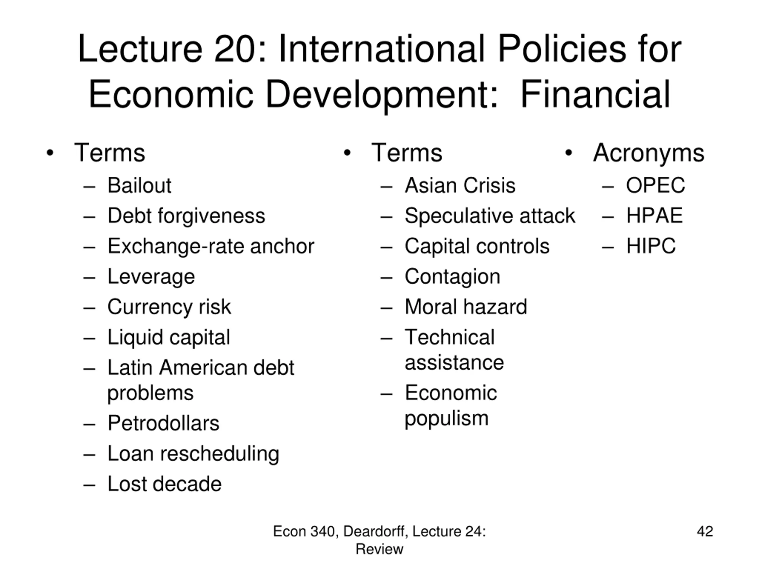 Lecture 20: International Policies for Economic Development: Financial Terms Bailout Debt forgiveness Exchange-rate anchor Leverage Currency risk Liquid capital Latin American debt problems Petrodollars Loan rescheduling Lost decade Terms Asian Crisis Speculative attack Capital controls Contagion Moral hazard Technical assistance Economic populism Acronyms OPEC HPAE HIPC Econ 340, Deardorff, Lecture 24: Review 42