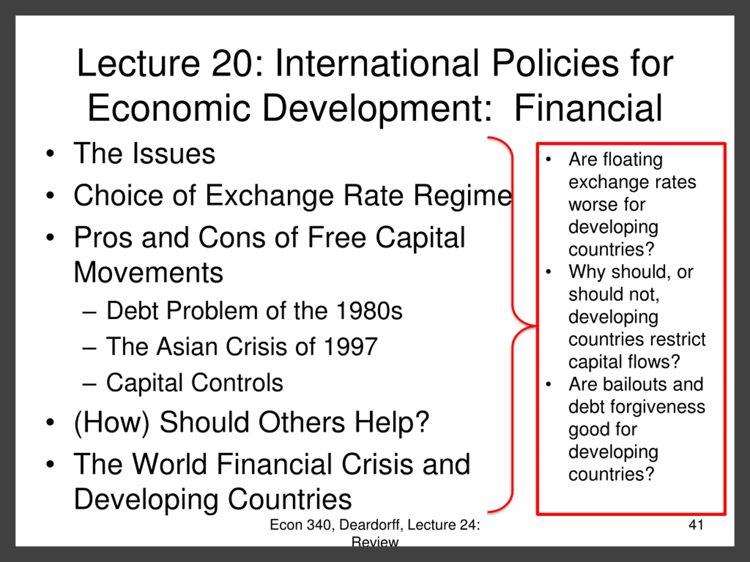 Lecture 20: International Policies for Economic Development: Financial The Issues Choice of Exchange Rate Regime Pros and Cons of Free Capital Movements Debt Problem of the 1980s The Asian Crisis of 1997 Capital Controls (How) Should Others Help? The World Financial Crisis and Developing Countries Are floating exchange rates worse for developing countries? Why should, or should not, developing countries restrict capital flows? Are bailouts and debt forgiveness good for developing countries? Econ 340, Deardorff, Lecture 24: Review 41
