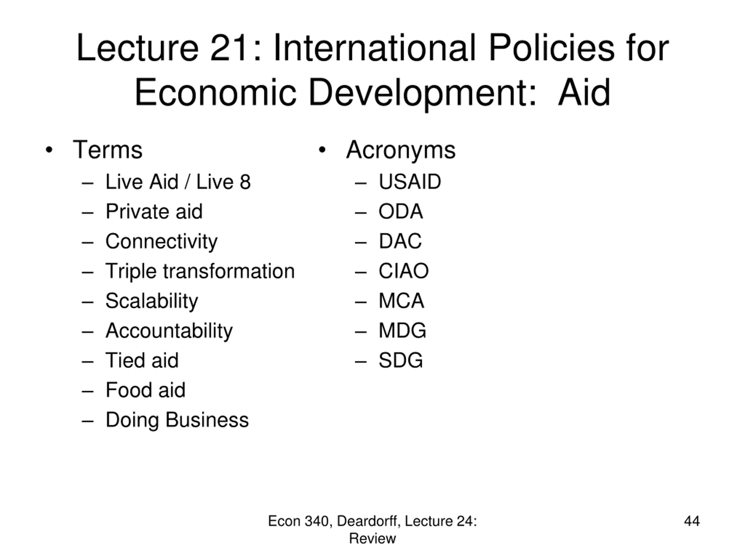 Lecture 21: International Policies for Economic Development: Aid Terms Live Aid / Live 8 Private aid Connectivity Triple transformation Scalability Accountability Tied aid Food aid Doing Business Acronyms USAID ODA DAC CIAO MCA MDG SDG Econ 340, Deardorff, Lecture 24: Review 44