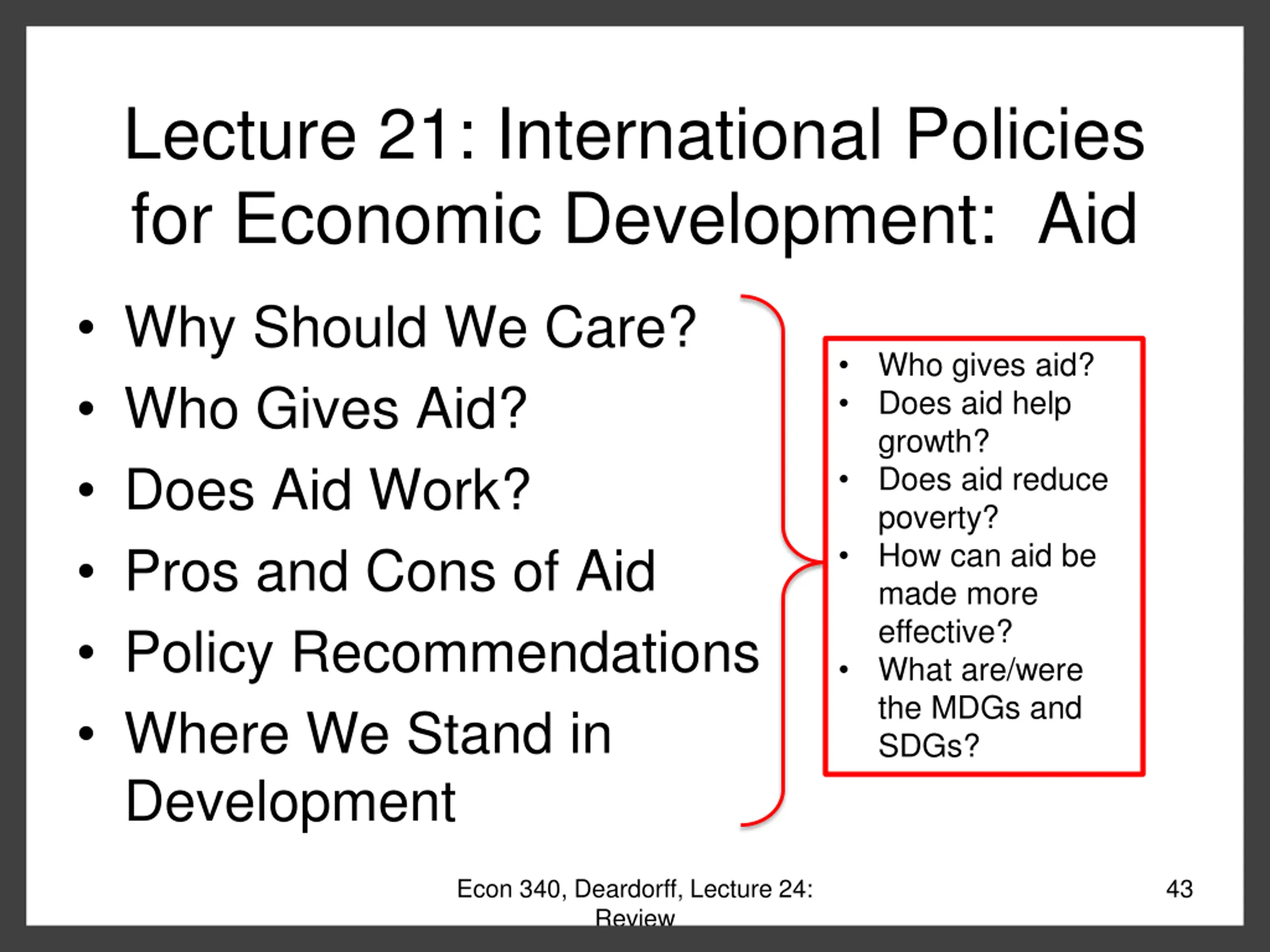 Lecture 21: International Policies for Economic Development: Aid Why Should We Care? Who Gives Aid? Does Aid Work? Pros and Cons of Aid Policy Recommendations Where We Stand in Development Who gives aid? Does aid help growth? Does aid reduce poverty? How can aid be made more effective? What are/were the MDGs and SDGs? Econ 340, Deardorff, Lecture 24: Review 43