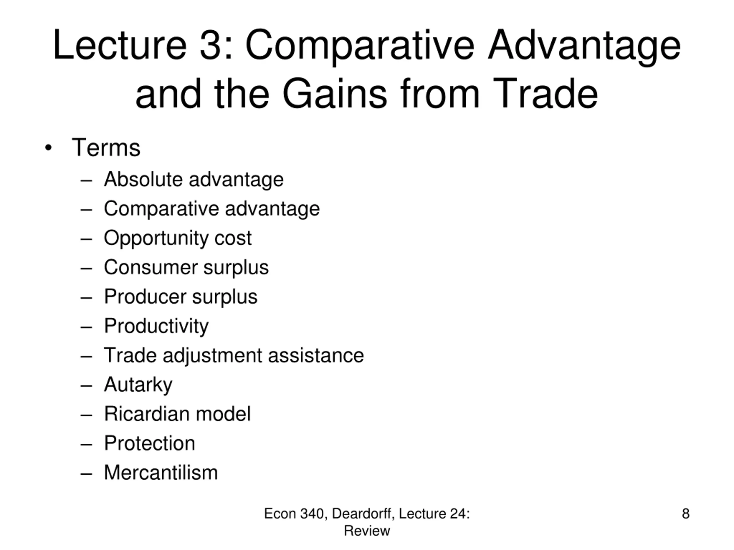 Lecture 3: Comparative Advantage and the Gains from Trade Terms Absolute advantage Comparative advantage Opportunity cost Consumer surplus Producer surplus Productivity Trade adjustment assistance Autarky Ricardian model Protection Mercantilism Econ 340, Deardorff, Lecture 24: Review 8