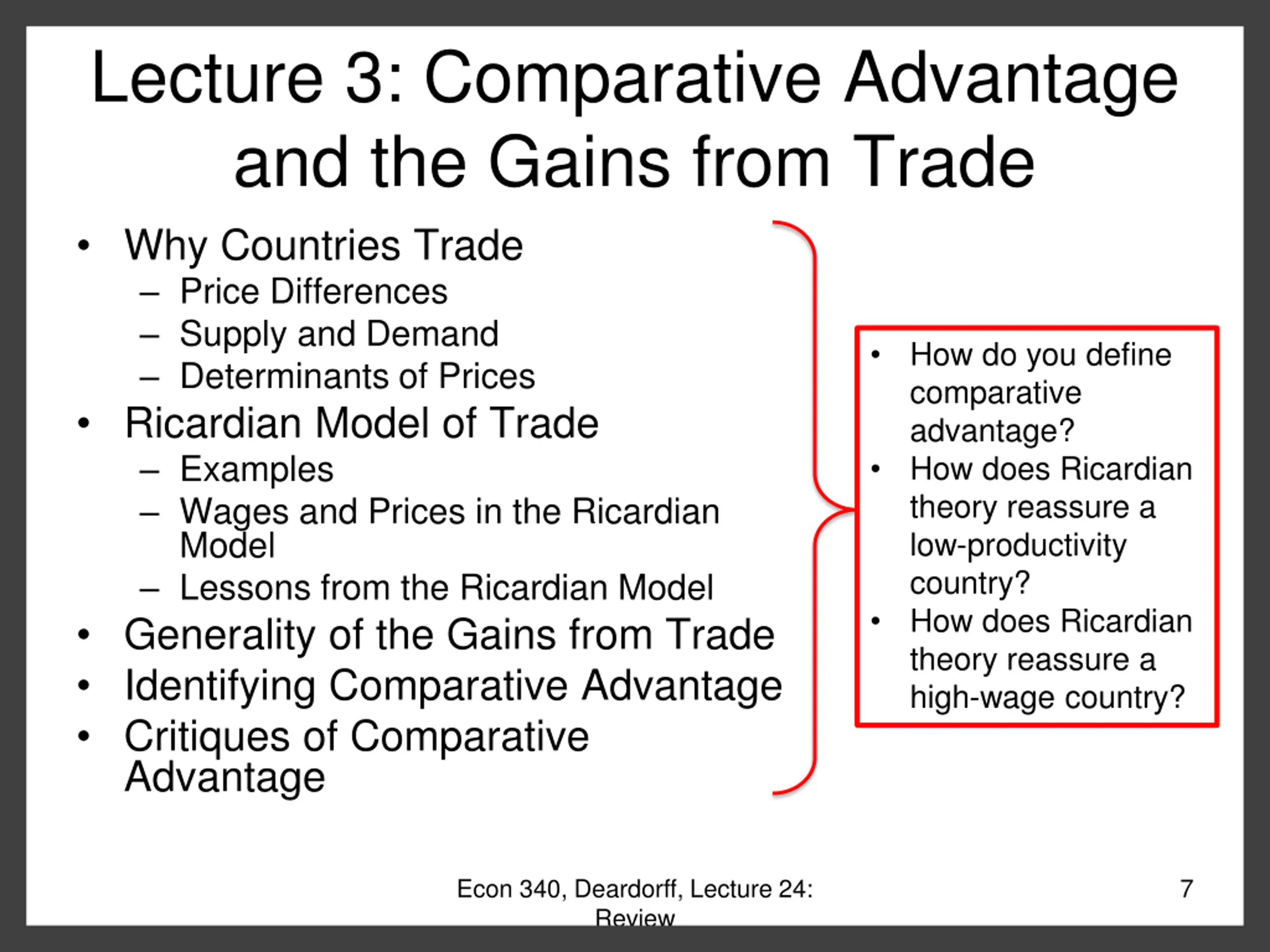 Lecture 3: Comparative Advantage and the Gains from Trade Why Countries Trade Price Differences Supply and Demand Determinants of Prices Ricardian Model of Trade Examples Wages and Prices in the Ricardian Model Lessons from the Ricardian Model Generality of the Gains from Trade Identifying Comparative Advantage Critiques of Comparative Advantage How do you define comparative advantage? How does Ricardian theory reassure a low-productivity country? How does Ricardian theory reassure a high-wage country? Econ 340, Deardorff, Lecture 24: Review 7