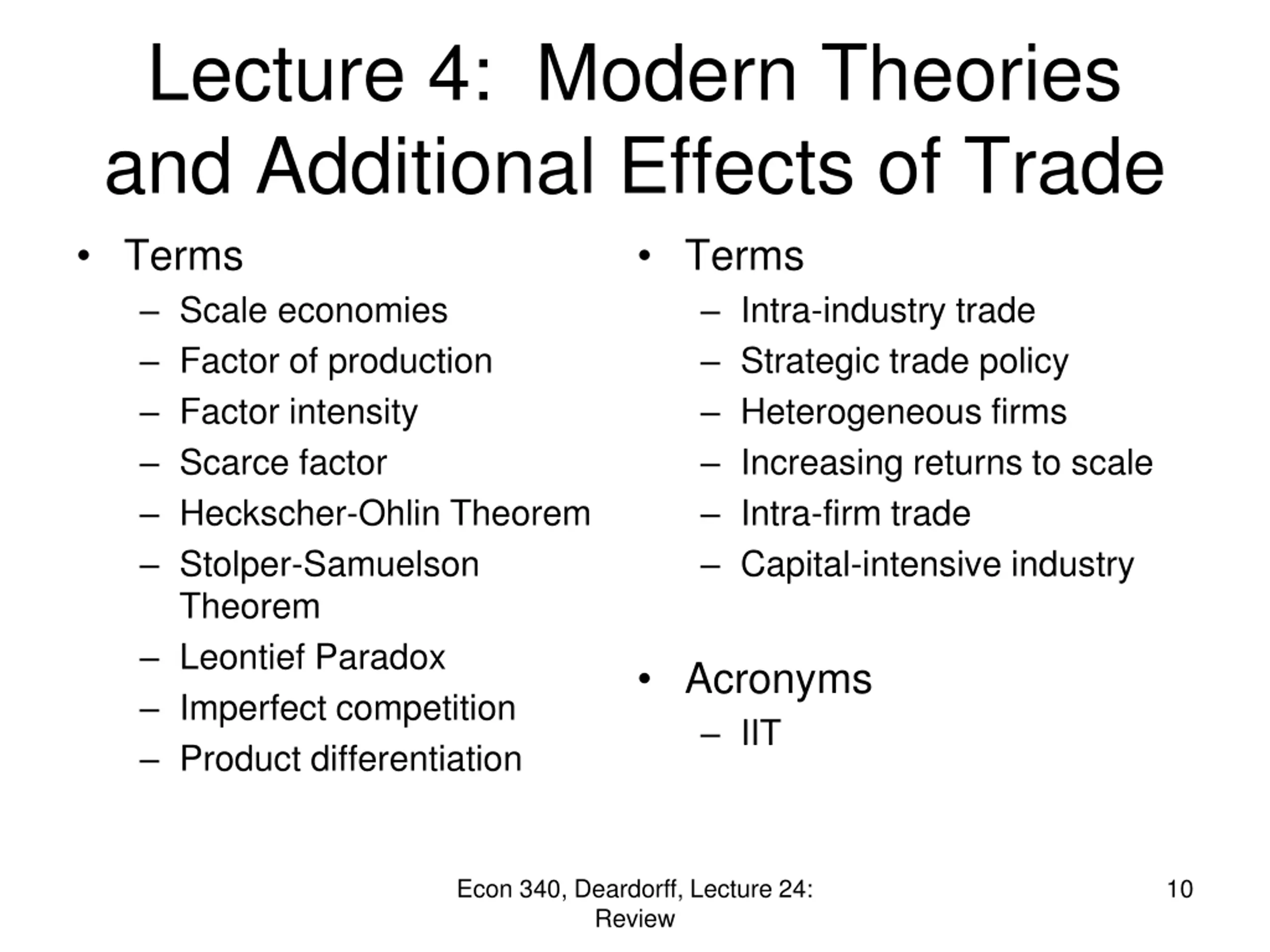 Lecture 4: Modern Theories and Additional Effects of Trade Terms Scale economies Factor of production Factor intensity Scarce factor Heckscher-Ohlin Theorem Stolper-Samuelson Theorem Leontief Paradox Imperfect competition Product differentiation Terms Intra-industry trade Strategic trade policy Heterogeneous firms Increasing returns to scale Intra-firm trade Capital-intensive industry Acronyms IIT Econ 340, Deardorff, Lecture 24: Review 10