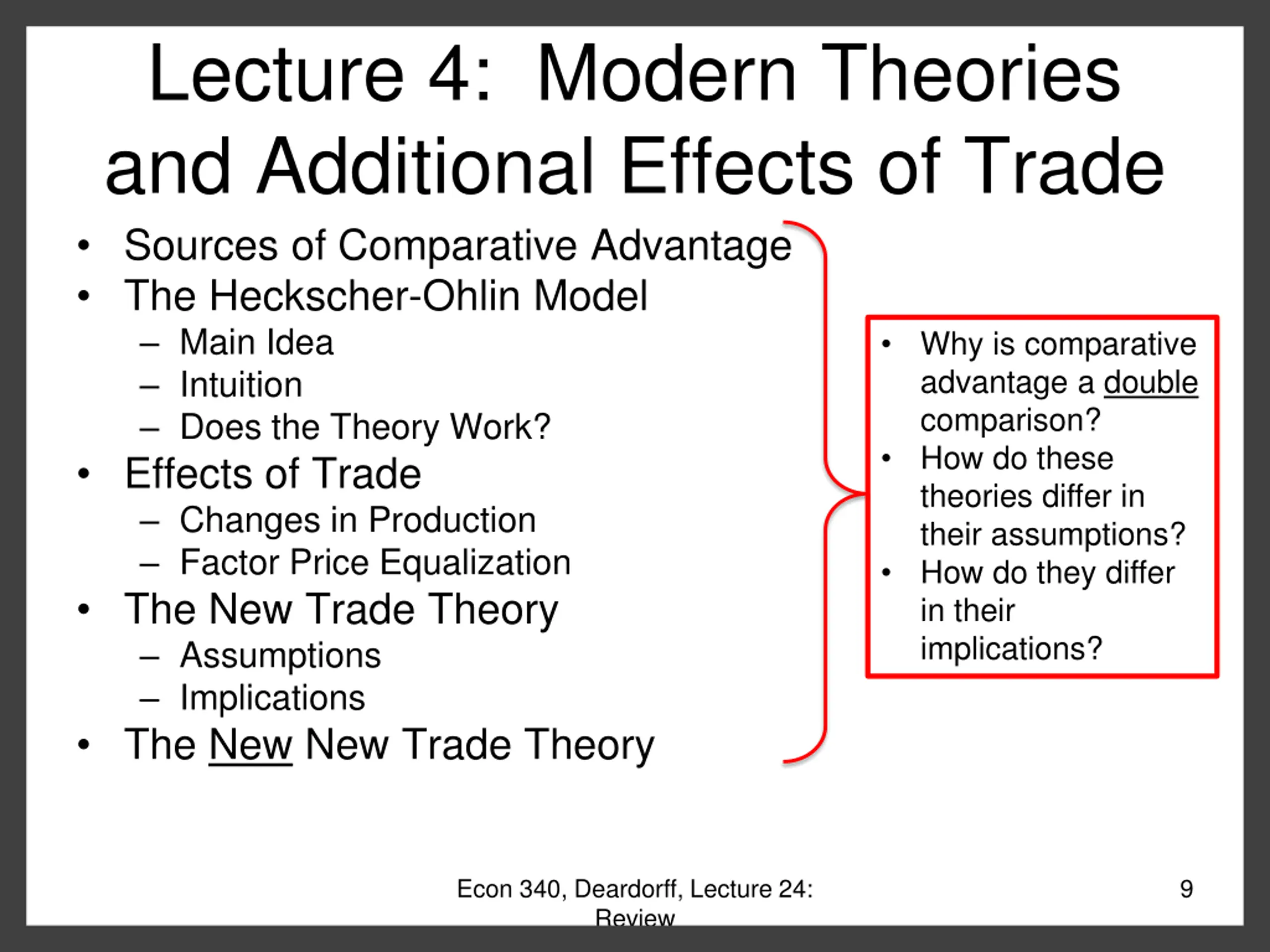 Lecture 4: Modern Theories and Additional Effects of Trade Sources of Comparative Advantage The Heckscher-Ohlin Model Main Idea Intuition Does the Theory Work? Effects of Trade Changes in Production Factor Price Equalization The New Trade Theory Assumptions Implications The New New Trade Theory Why is comparative advantage a double comparison? How do these theories differ in their assumptions? How do they differ in their implications? Econ 340, Deardorff, Lecture 24: Review 9