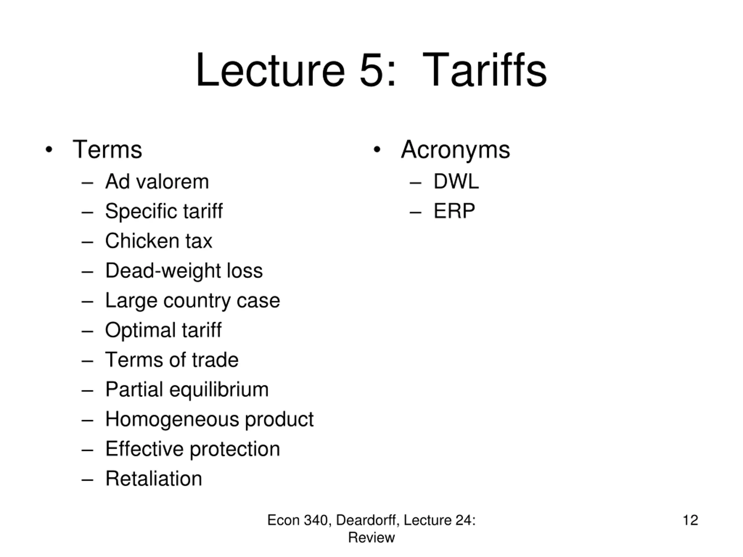 Lecture 5: Tariffs Terms Ad valorem Specific tariff Chicken tax Dead-weight loss Large country case Optimal tariff Terms of trade Partial equilibrium Homogeneous product Effective protection Retaliation Acronyms DWL ERP Econ 340, Deardorff, Lecture 24: Review 12