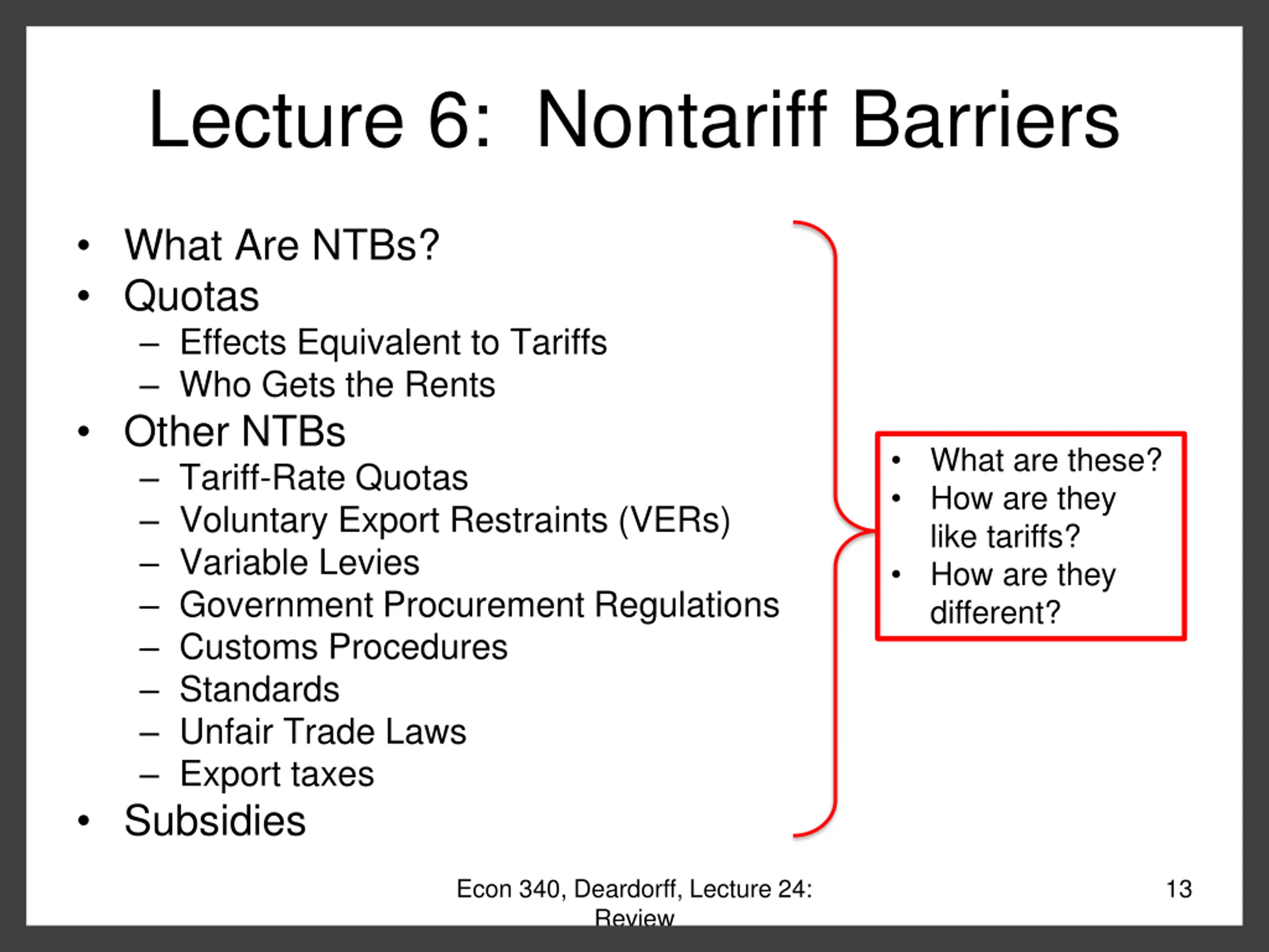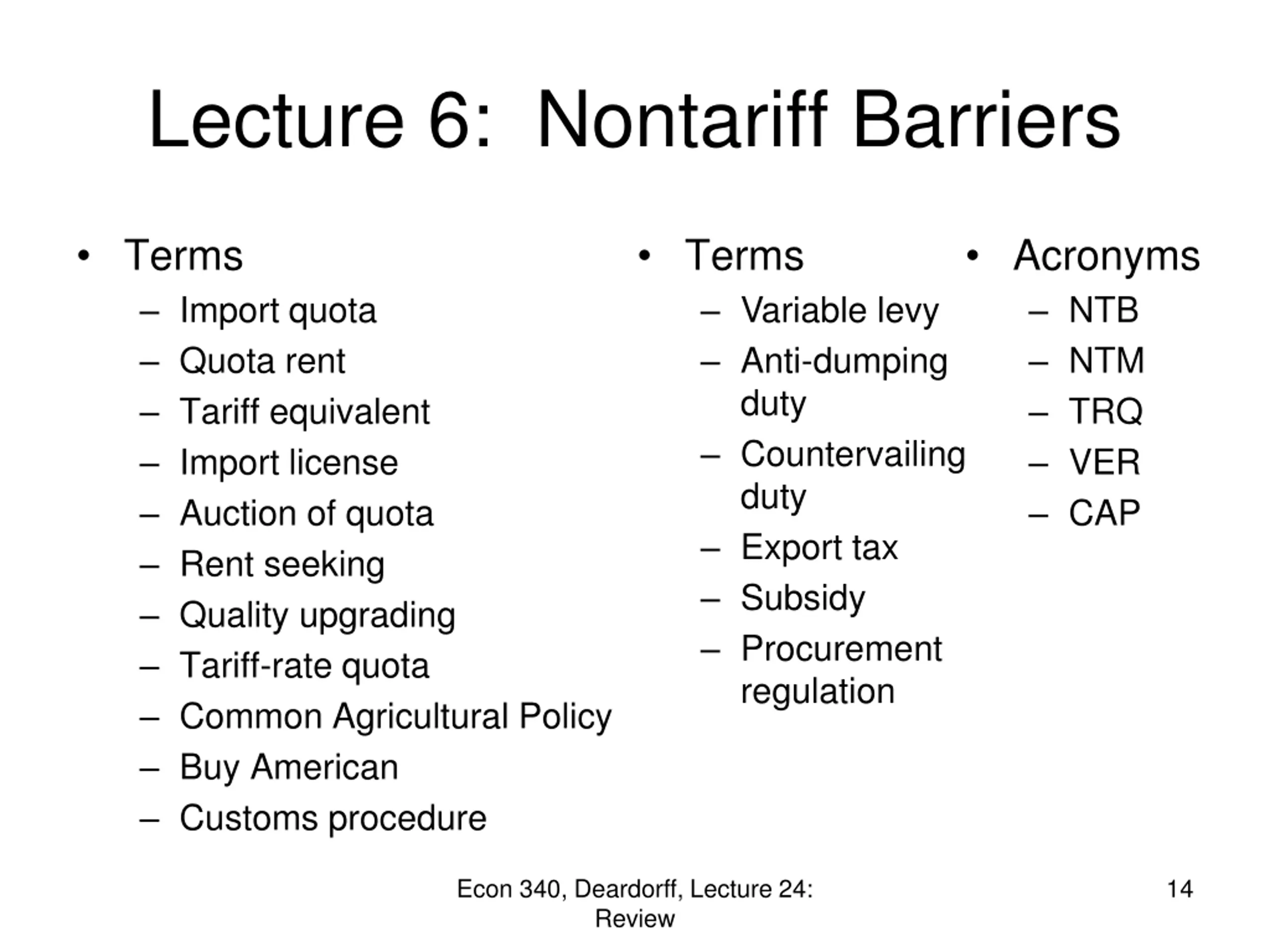 Lecture 6: Nontariff Barriers Terms Import quota Quota rent Tariff equivalent Import license Auction of quota Rent seeking Quality upgrading Tariff-rate quota Common Agricultural Policy Buy American Customs procedure Terms Variable levy Anti-dumping duty Countervailing duty Export tax Subsidy Procurement regulation Acronyms NTB NTM TRQ VER CAP Econ 340, Deardorff, Lecture 24: Review 14
