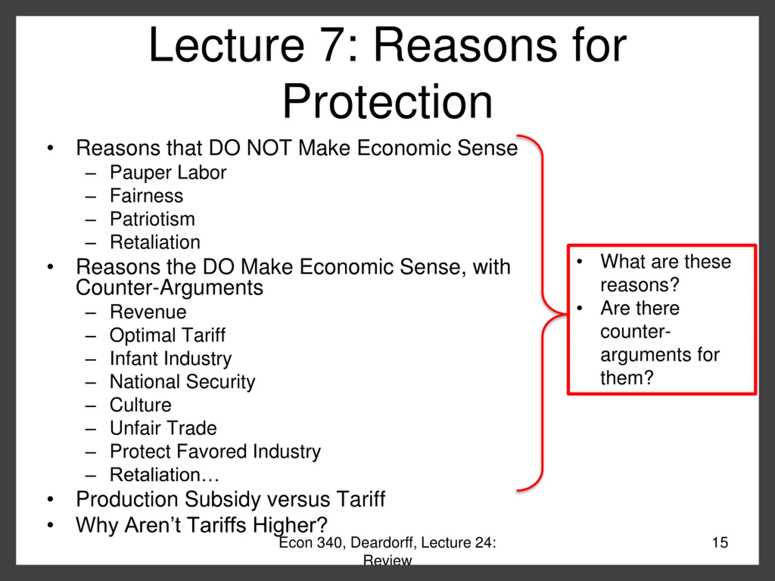 Lecture 7: Reasons for Protection Reasons that DO NOT Make Economic Sense Pauper Labor Fairness Patriotism Retaliation Reasons the DO Make Economic Sense, with Counter-Arguments Revenue Optimal Tariff Infant Industry National Security Culture Unfair Trade Protect Favored Industry Retaliation Production Subsidy versus Tariff Why Aren t Tariffs Higher? What are these reasons? Are there counter- arguments for them? Econ 340, Deardorff, Lecture 24: Review 15