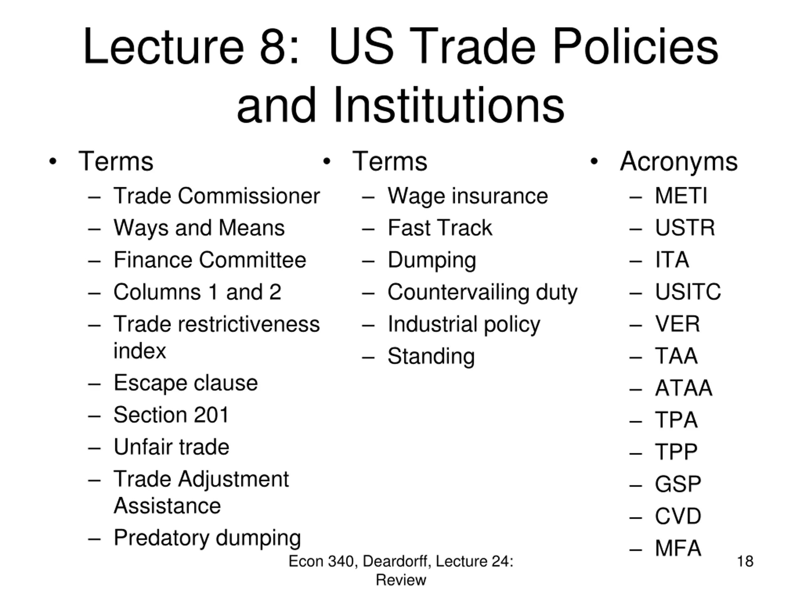 Lecture 8: US Trade Policies and Institutions Terms Trade Commissioner Ways and Means Finance Committee Columns 1 and 2 Trade restrictiveness index Escape clause Section 201 Unfair trade Trade Adjustment Assistance Predatory dumping Econ 340, Deardorff, Lecture 24: Review Terms Wage insurance Fast Track Dumping Countervailing duty Industrial policy Standing Acronyms METI USTR ITA USITC VER TAA ATAA TPA TPP GSP CVD MFA 18