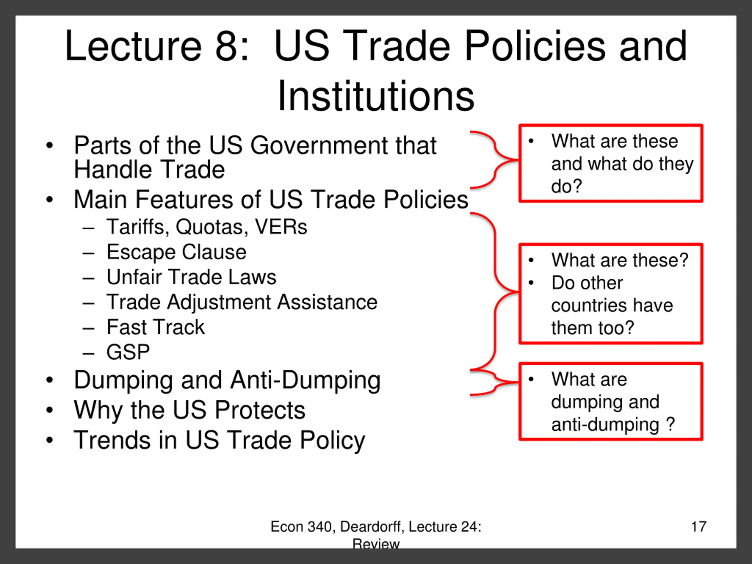 Lecture 8: US Trade Policies and Institutions Parts of the US Government that Handle Trade Main Features of US Trade Policies Tariffs, Quotas, VERs Escape Clause Unfair Trade Laws Trade Adjustment Assistance Fast Track GSP Dumping and Anti-Dumping Why the US Protects Trends in US Trade Policy What are these and what do they do? What are these? Do other countries have them too? What are dumping and anti-dumping ? Econ 340, Deardorff, Lecture 24: Review 17