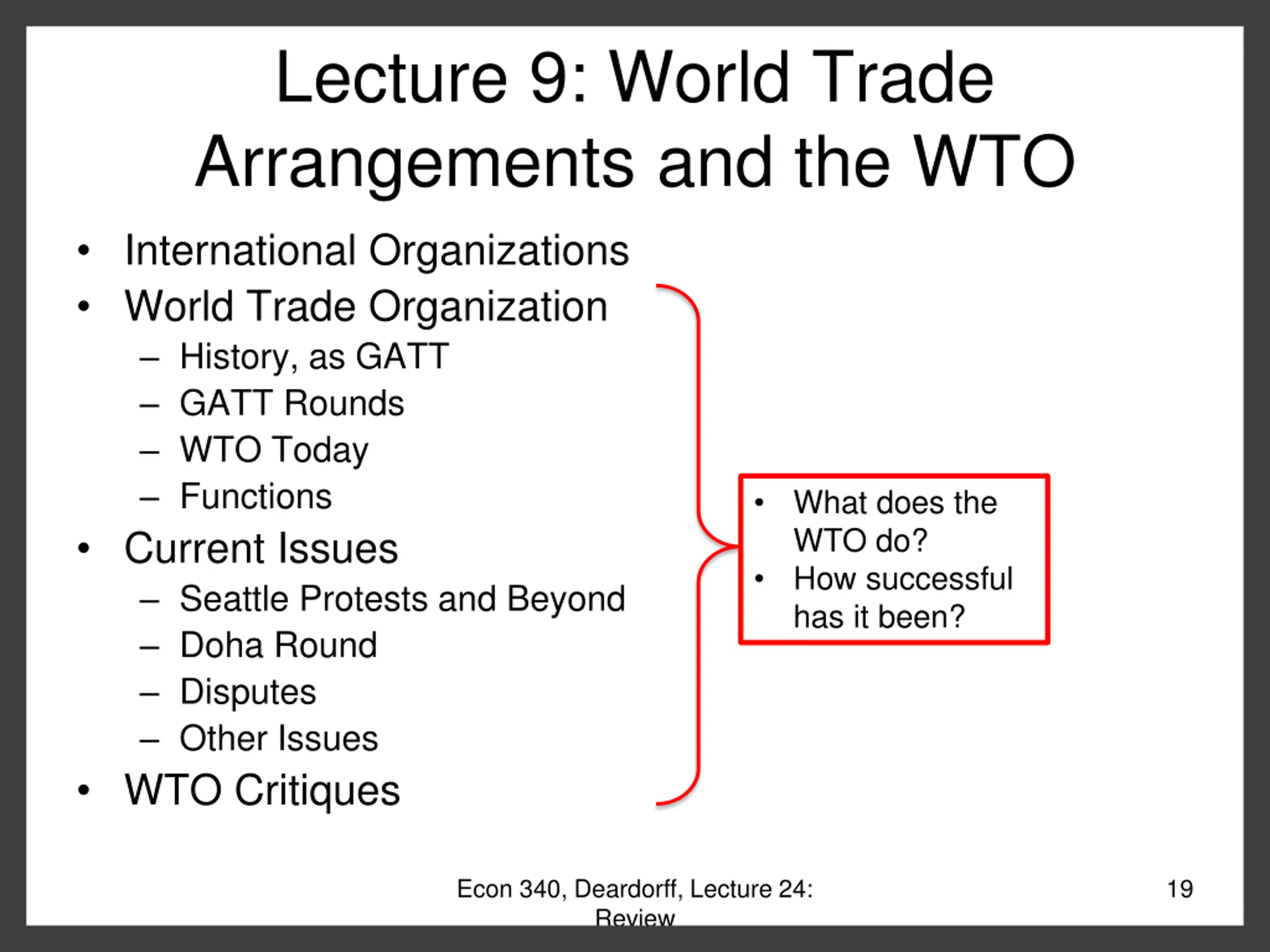 Lecture 9: World Trade Arrangements and the WTO International Organizations World Trade Organization History, as GATT GATT Rounds WTO Today Functions Current Issues Seattle Protests and Beyond Doha Round Disputes Other Issues WTO Critiques What does the WTO do? How successful has it been? Econ 340, Deardorff, Lecture 24: Review 19