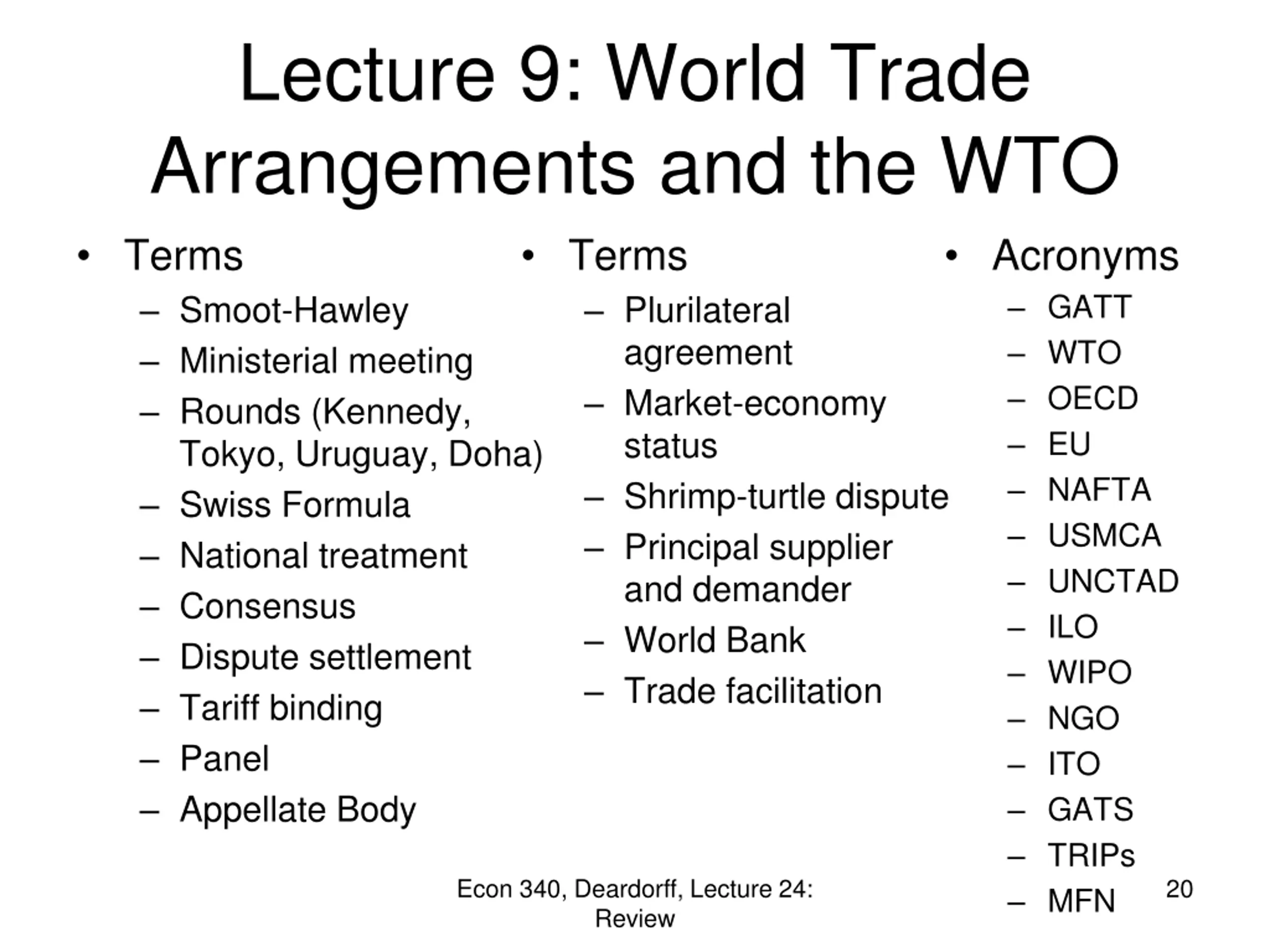 Lecture 9: World Trade Arrangements and the WTO Terms Smoot-Hawley Ministerial meeting Rounds (Kennedy, Tokyo, Uruguay, Doha) Swiss Formula National treatment Consensus Dispute settlement Tariff binding Panel Appellate Body Terms Plurilateral agreement Market-economy status Shrimp-turtle dispute Principal supplier and demander World Bank Trade facilitation Acronyms GATT WTO OECD EU NAFTA USMCA UNCTAD ILO WIPO NGO ITO GATS TRIPs MFN Econ 340, Deardorff, Lecture 24: Review 20