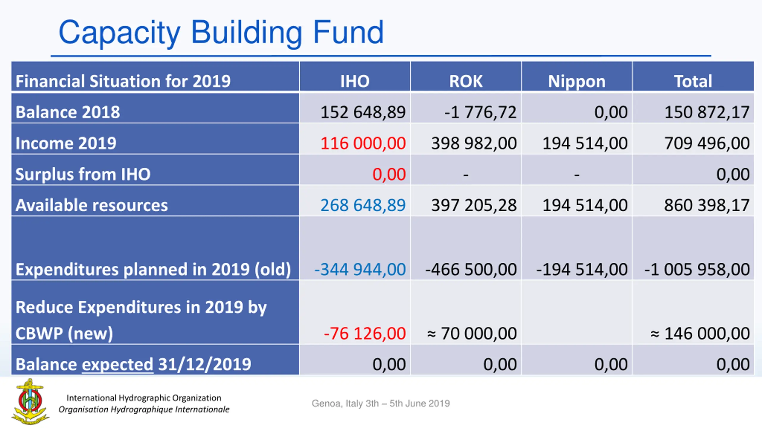 Capacity Building Fund Financial Situation for 2019 IHO ROK Nippon Total Balance 2018 152 648,89 -1 776,72 0,00 150 872,17 Income 2019 116 000,00 398 982,00 194 514,00 709 496,00 Surplus from IHO 0,00 - - 0,00 Available resources 268 648,89 397 205,28 194 514,00 860 398,17 Expenditures planned in 2019 (old) -344 944,00 -466 500,00 -194 514,00 -1 005 958,00 Reduce Expenditures in 2019 by CBWP (new) -76 126,00 70 000,00 146 000,00 Balance expected 31/12/2019 0,00 0,00 0,00 0,00 International Hydrographic Organization Organisation Hydrographique Internationale Genoa, Italy 3th 5th June 2019