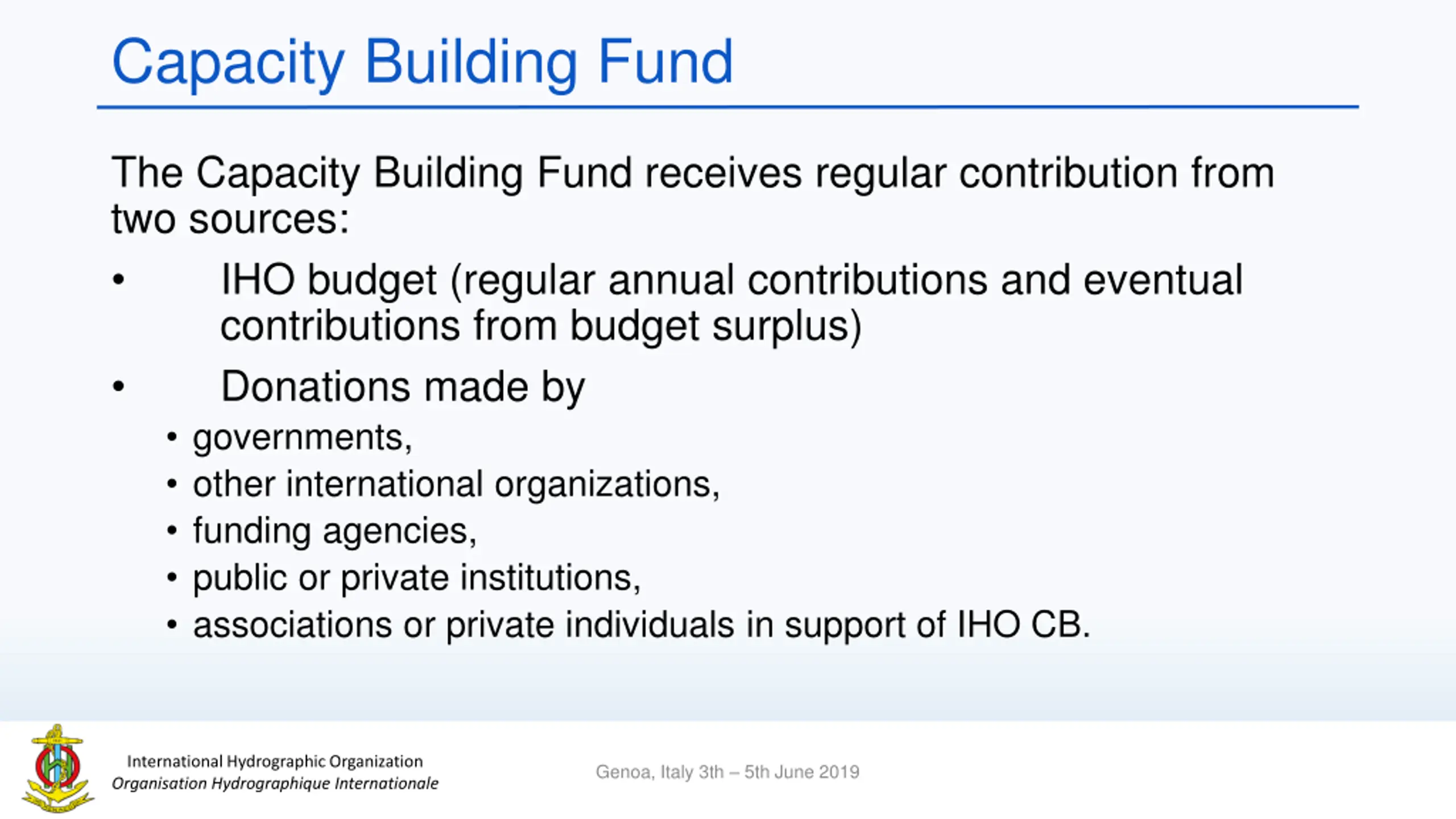 Capacity Building Fund The Capacity Building Fund receives regular contribution from two sources: IHO budget (regular annual contributions and eventual contributions from budget surplus) Donations made by governments, other international organizations, funding agencies, public or private institutions, associations or private individuals in support of IHO CB. International Hydrographic Organization Organisation Hydrographique Internationale Genoa, Italy 3th 5th June 2019