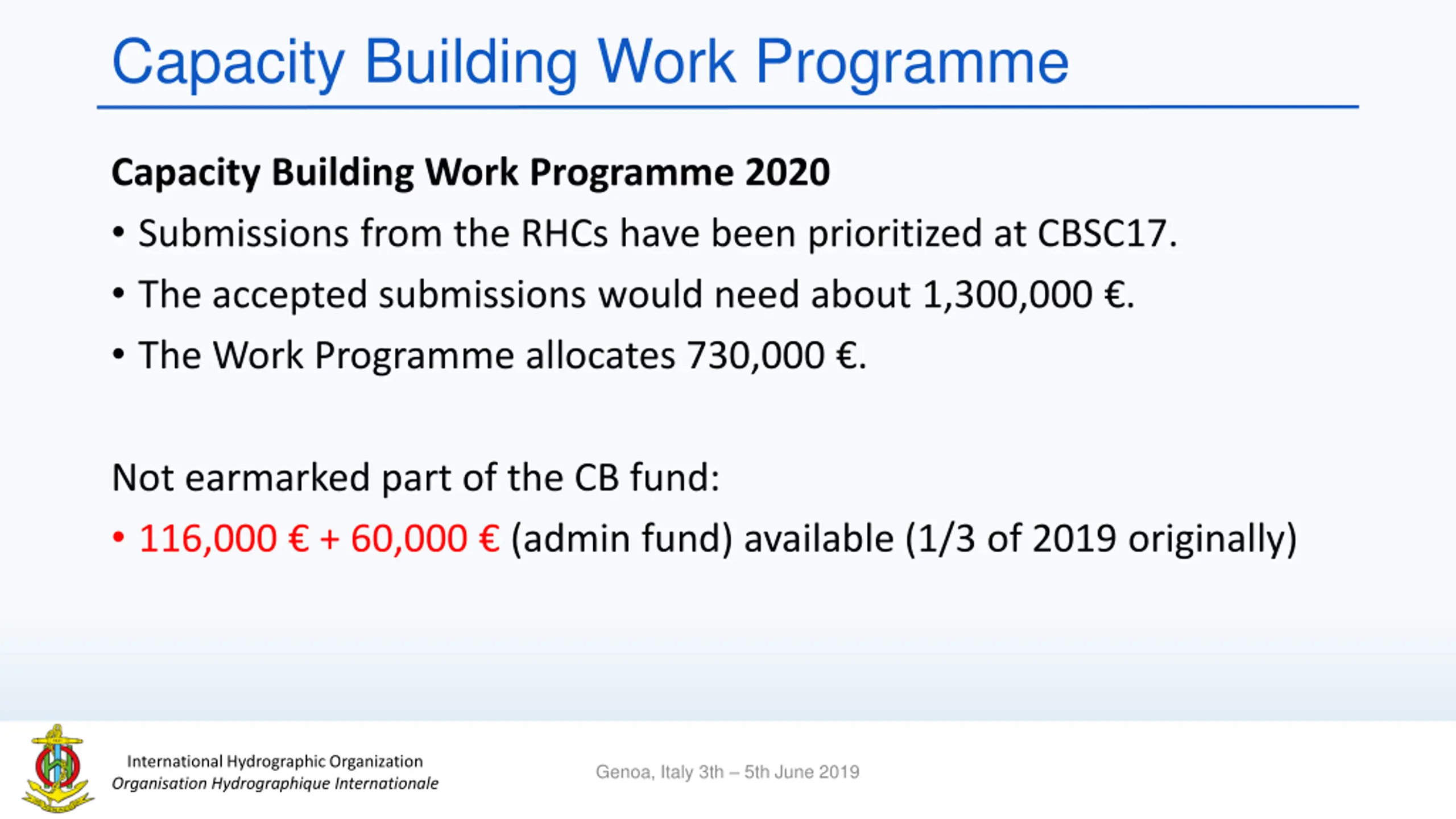 Capacity Building Work Programme Capacity Building Work Programme 2020 Submissions from the RHCs have been prioritized at CBSC17. The accepted submissions would need about 1,300,000 . The Work Programme allocates 730,000 . Not earmarked part of the CB fund: 116,000 + 60,000 (admin fund) available (1/3 of 2019 originally) International Hydrographic Organization Organisation Hydrographique Internationale Genoa, Italy 3th 5th June 2019