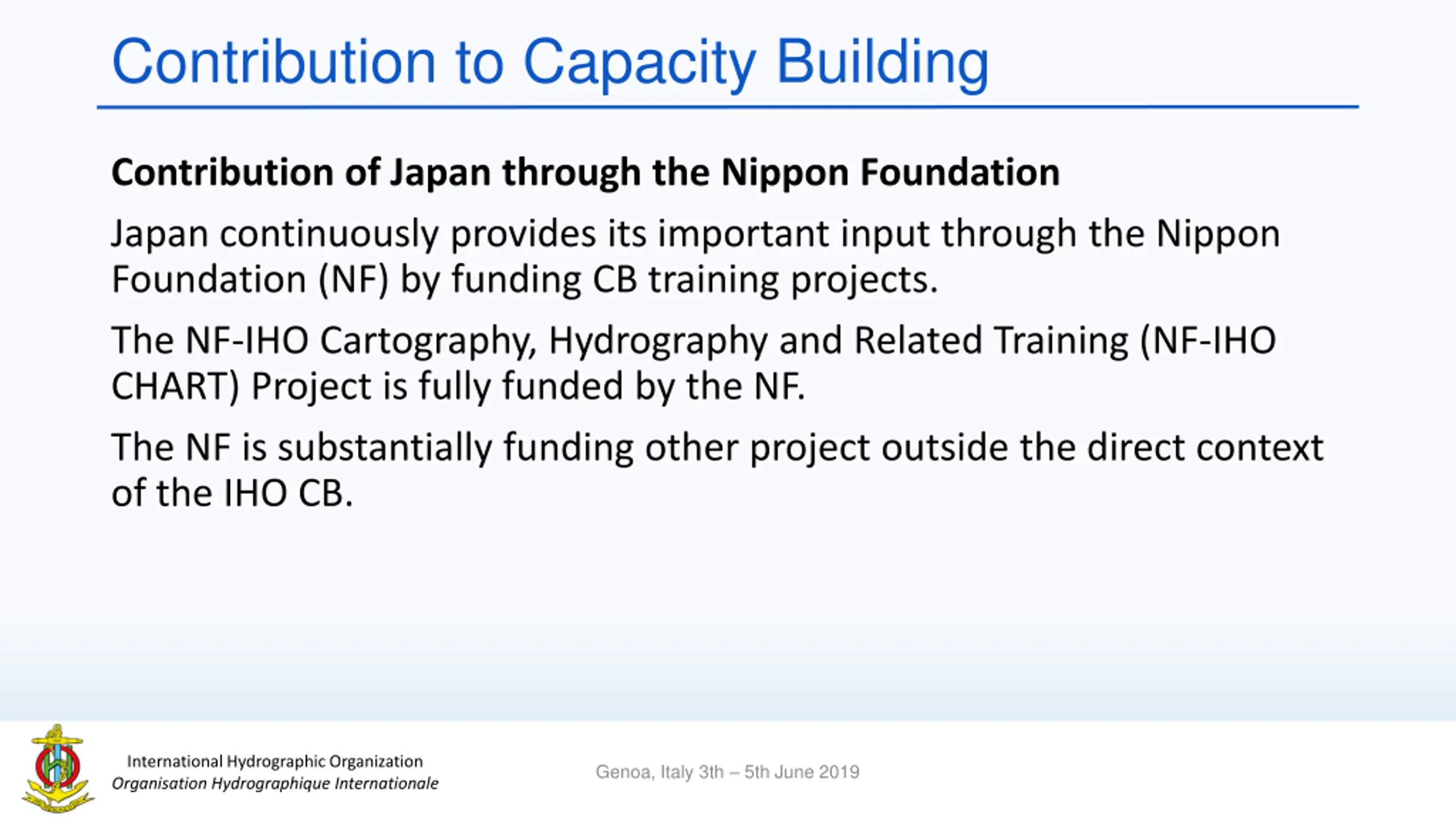 Contribution to Capacity Building Contribution of Japan through the Nippon Foundation Japan continuously provides its important input through the Nippon Foundation (NF) by funding CB training projects. The NF-IHO Cartography, Hydrography and Related Training (NF-IHO CHART) Project is fully funded by the NF. The NF is substantially funding other project outside the direct context of the IHO CB. International Hydrographic Organization Organisation Hydrographique Internationale Genoa, Italy 3th 5th June 2019