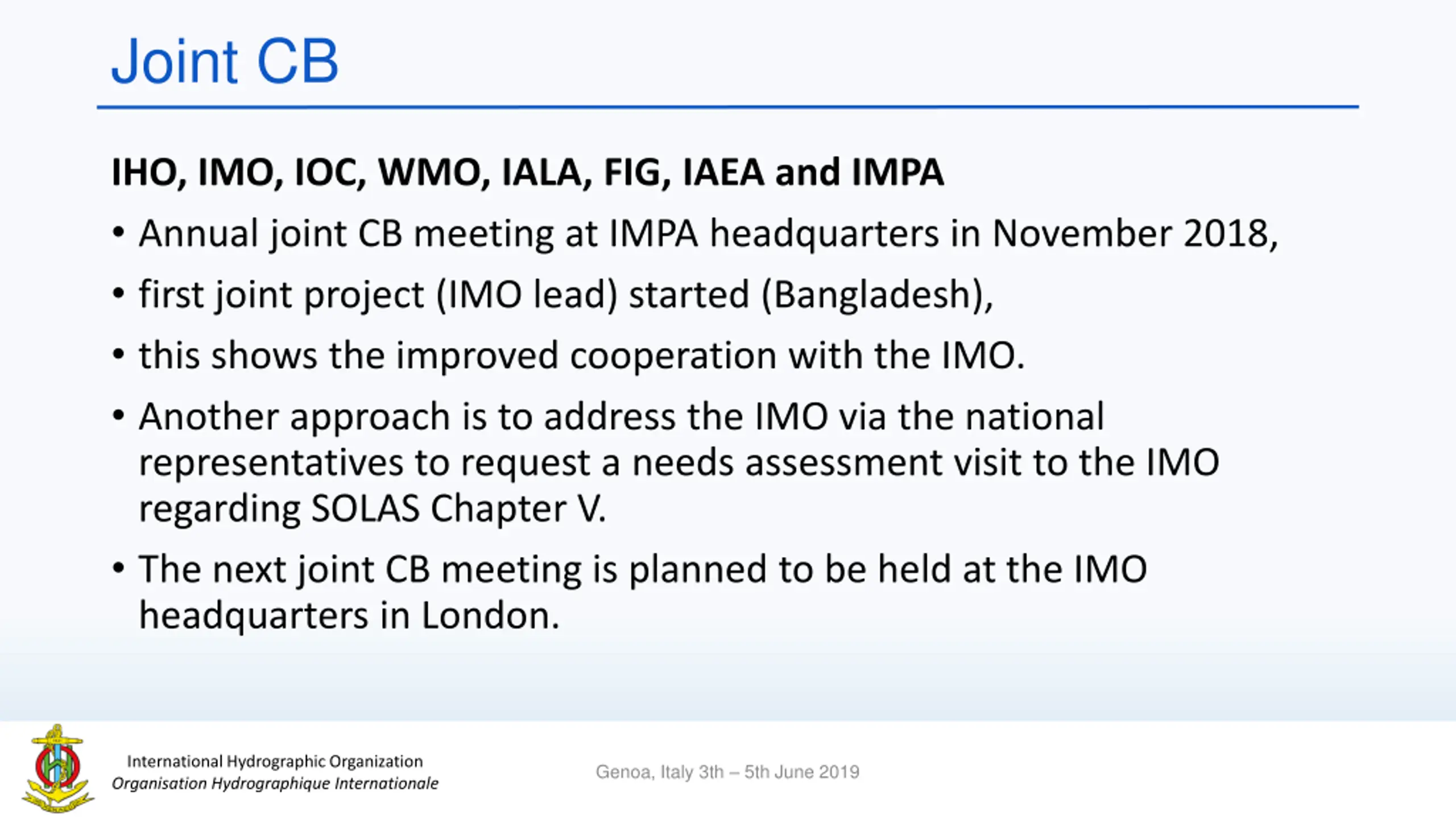 Joint CB IHO, IMO, IOC, WMO, IALA, FIG, IAEA and IMPA Annual joint CB meeting at IMPA headquarters in November 2018, first joint project (IMO lead) started (Bangladesh), this shows the improved cooperation with the IMO. Another approach is to address the IMO via the national representatives to request a needs assessment visit to the IMO regarding SOLAS Chapter V. The next joint CB meeting is planned to be held at the IMO headquarters in London. International Hydrographic Organization Organisation Hydrographique Internationale Genoa, Italy 3th 5th June 2019