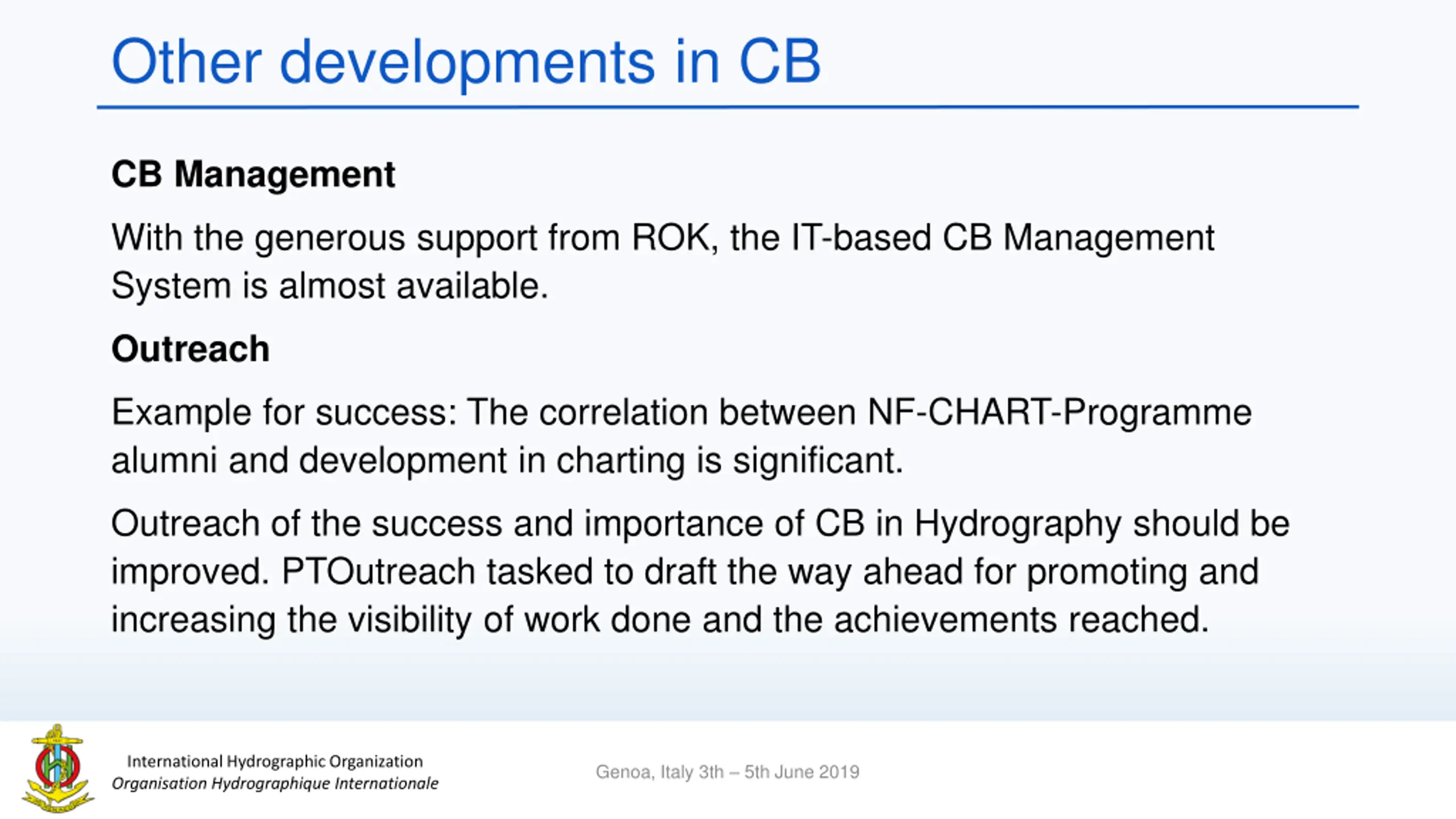 Other developments in CB CB Management With the generous support from ROK, the IT-based CB Management System is almost available. Outreach Example for success: The correlation between NF-CHART-Programme alumni and development in charting is significant. Outreach of the success and importance of CB in Hydrography should be improved. PTOutreach tasked to draft the way ahead for promoting and increasing the visibility of work done and the achievements reached. International Hydrographic Organization Organisation Hydrographique Internationale Genoa, Italy 3th 5th June 2019