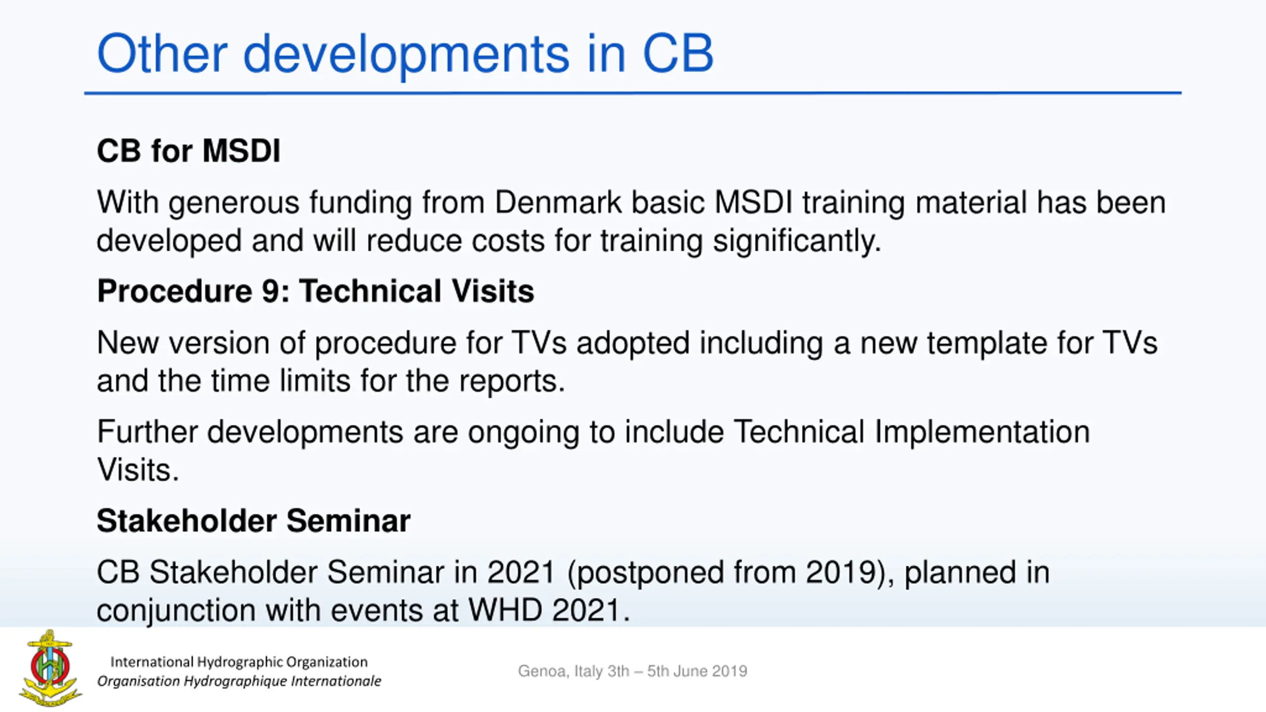 Other developments in CB CB for MSDI With generous funding from Denmark basic MSDI training material has been developed and will reduce costs for training significantly. Procedure 9: Technical Visits New version of procedure for TVs adopted including a new template for TVs and the time limits for the reports. Further developments are ongoing to include Technical Implementation Visits. Stakeholder Seminar CB Stakeholder Seminar in 2021 (postponed from 2019), planned in conjunction with events at WHD 2021. International Hydrographic Organization Organisation Hydrographique Internationale Genoa, Italy 3th 5th June 2019