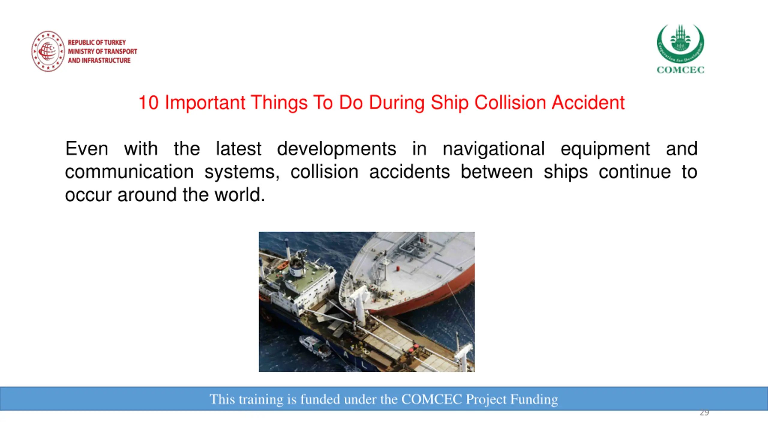 10 Important Things To Do During Ship Collision Accident Even with the latest developments in navigational equipment and communication systems, collision accidents between ships continue to occur around the world. This training is funded under the COMCEC Project Funding 29