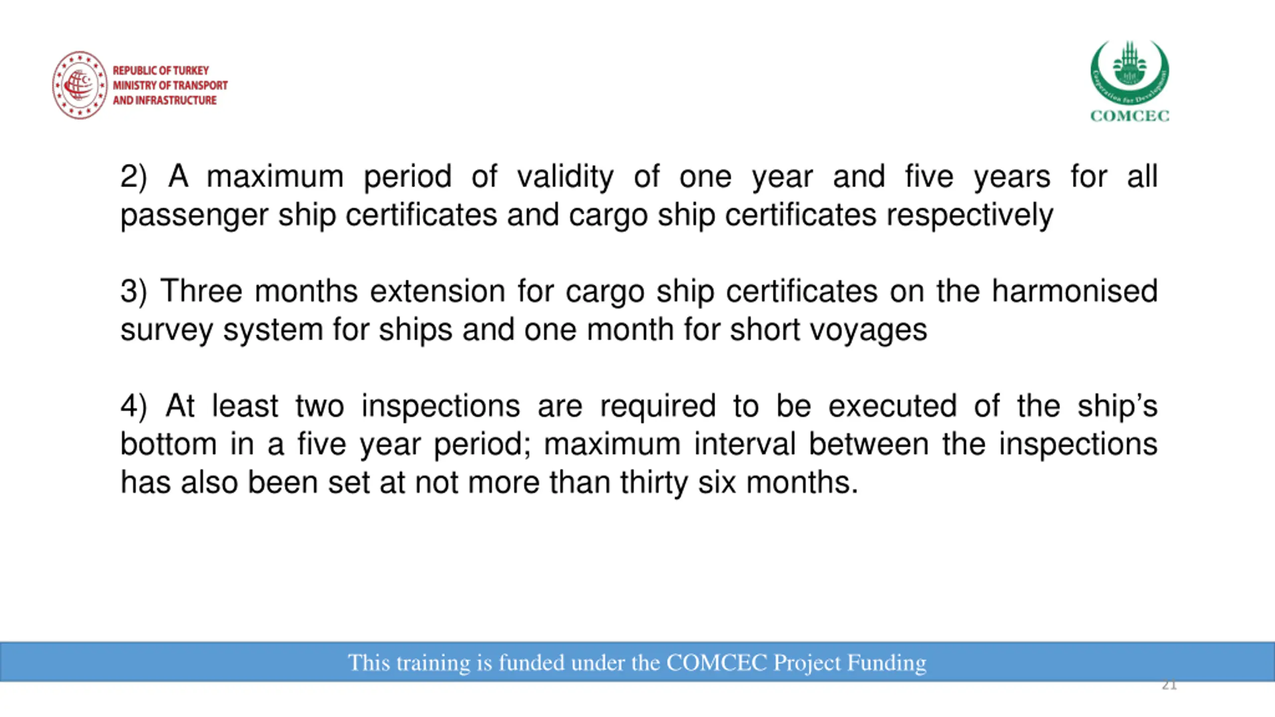 2) A maximum period of validity of one year and five years for all passenger ship certificates and cargo ship certificates respectively 3) Three months extension for cargo ship certificates on the harmonised survey system for ships and one month for short voyages 4) At least two inspections are required to be executed of the ship s bottom in a five year period; maximum interval between the inspections has also been set at not more than thirty six months. This training is funded under the COMCEC Project Funding 21