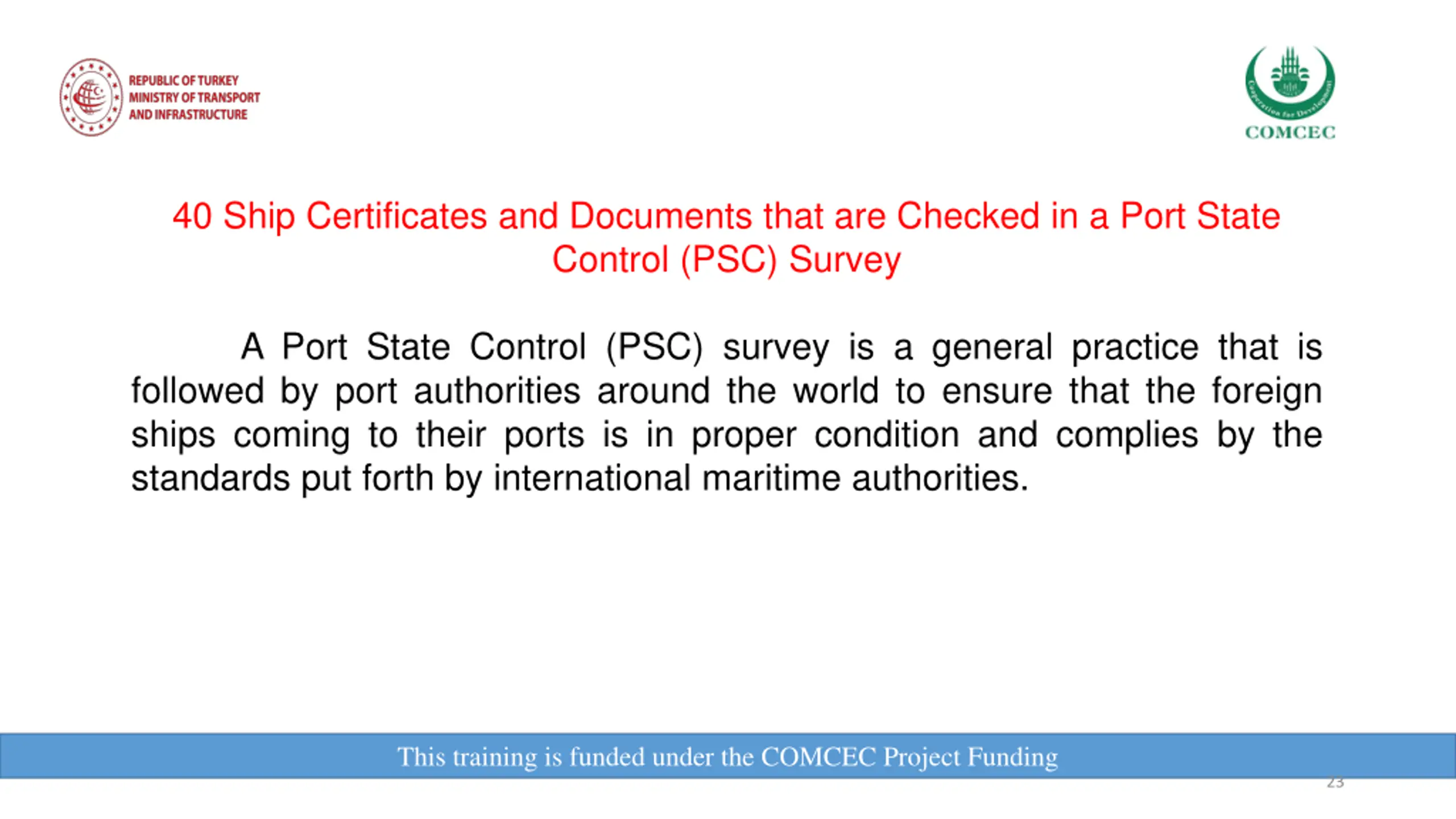 40 Ship Certificates and Documents that are Checked in a Port State Control (PSC) Survey followed by port authorities around the world to ensure that the foreign ships coming to their ports is in proper condition and complies by the standards put forth by international maritime authorities. A Port State Control (PSC) survey is a general practice that is This training is funded under the COMCEC Project Funding 23