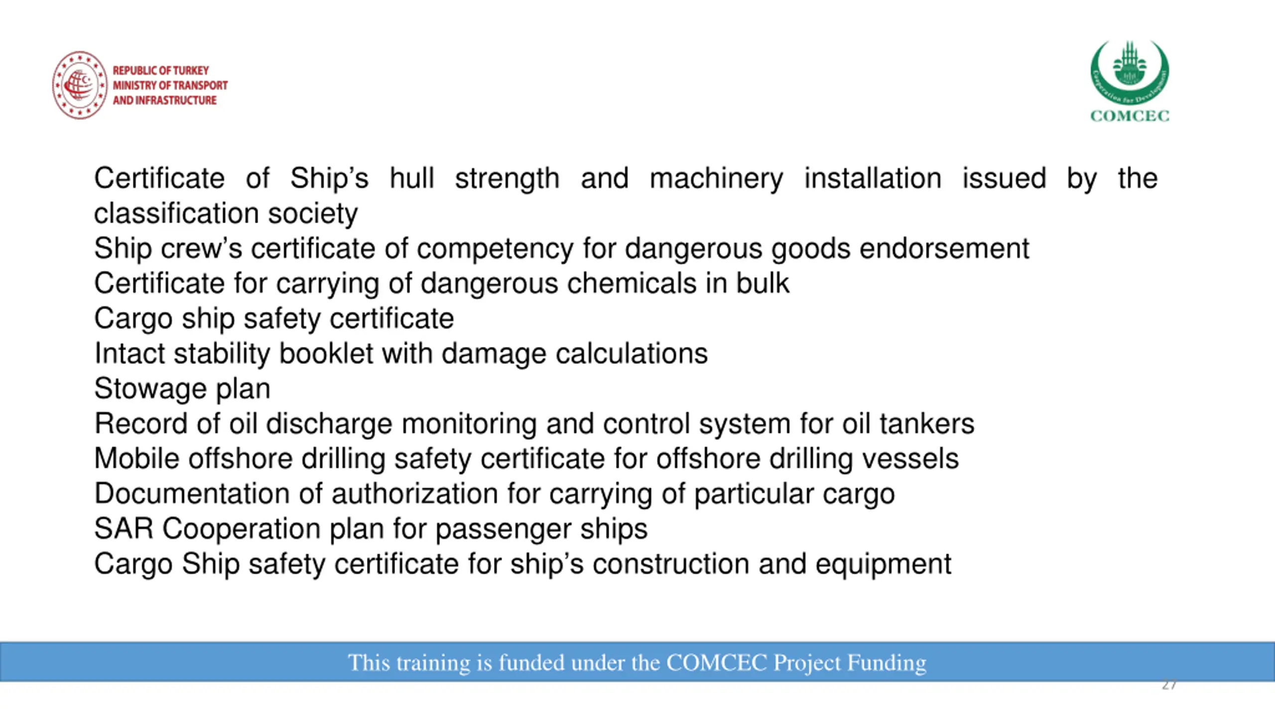 Certificate of Ships hull strength and machinery installation issued by the classification society Ship crew s certificate of competency for dangerous goods endorsement Certificate for carrying of dangerous chemicals in bulk Cargo ship safety certificate Intact stability booklet with damage calculations Stowage plan Record of oil discharge monitoring and control system for oil tankers Mobile offshore drilling safety certificate for offshore drilling vessels Documentation of authorization for carrying of particular cargo SAR Cooperation plan for passenger ships Cargo Ship safety certificate for ship s construction and equipment This training is funded under the COMCEC Project Funding 27