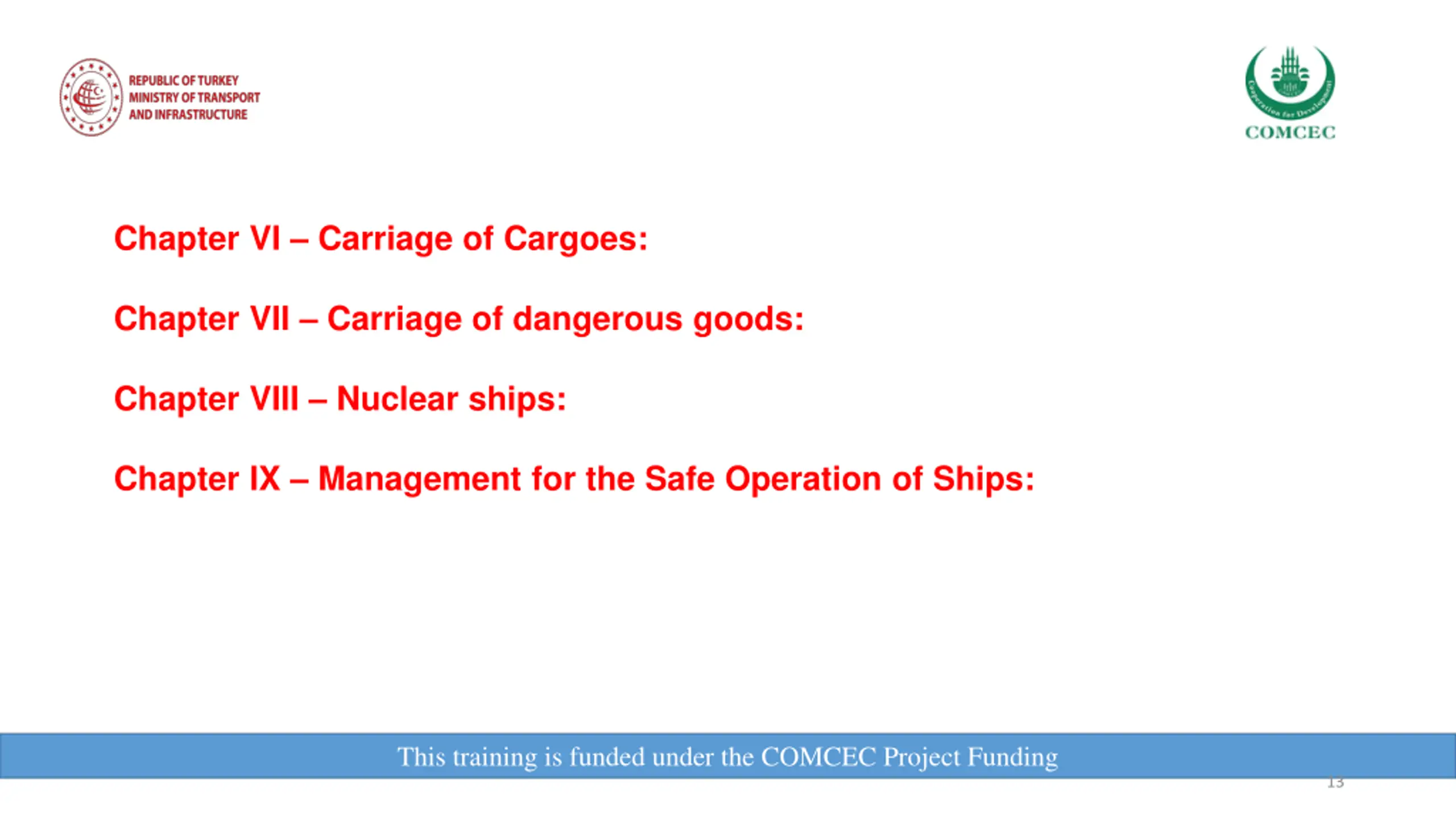 Chapter VI Carriage of Cargoes: Chapter VII Carriage of dangerous goods: Chapter VIII Nuclear ships: Chapter IX Management for the Safe Operation of Ships: This training is funded under the COMCEC Project Funding 13