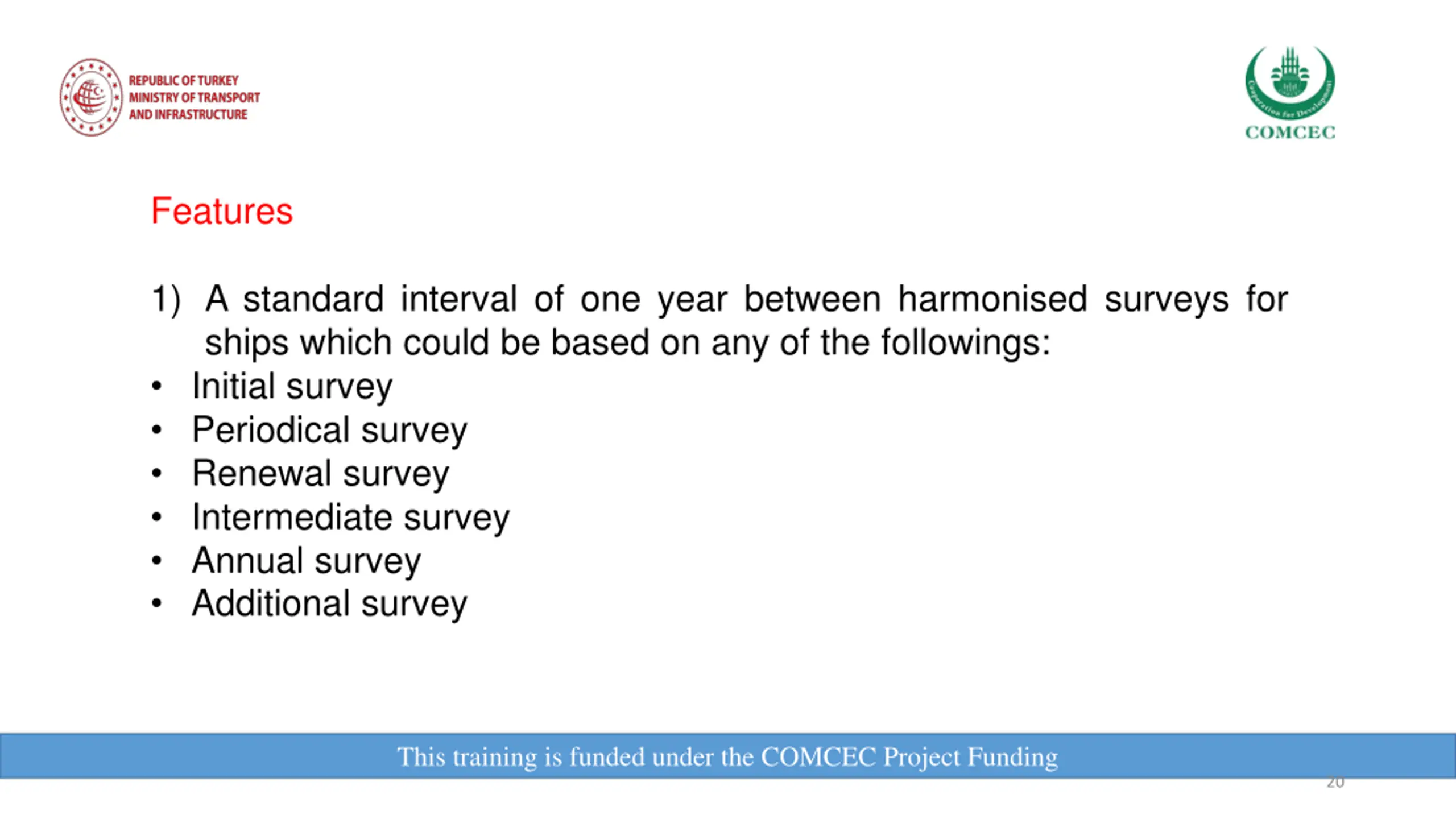 Features 1) A standard interval of one year between harmonised surveys for ships which could be based on any of the followings: Initial survey Periodical survey Renewal survey Intermediate survey Annual survey Additional survey This training is funded under the COMCEC Project Funding 20
