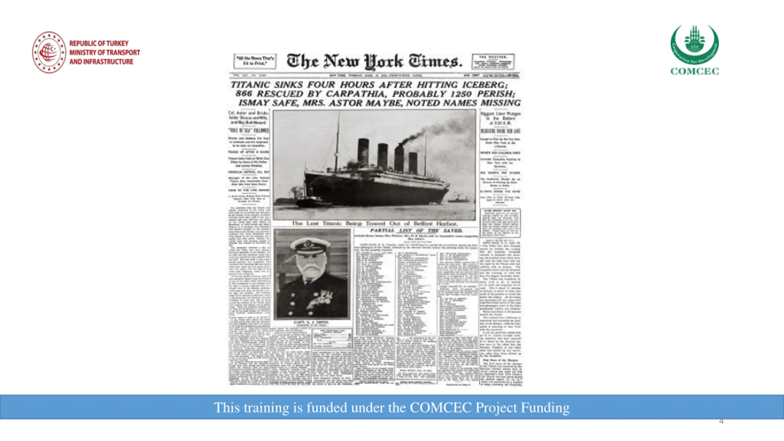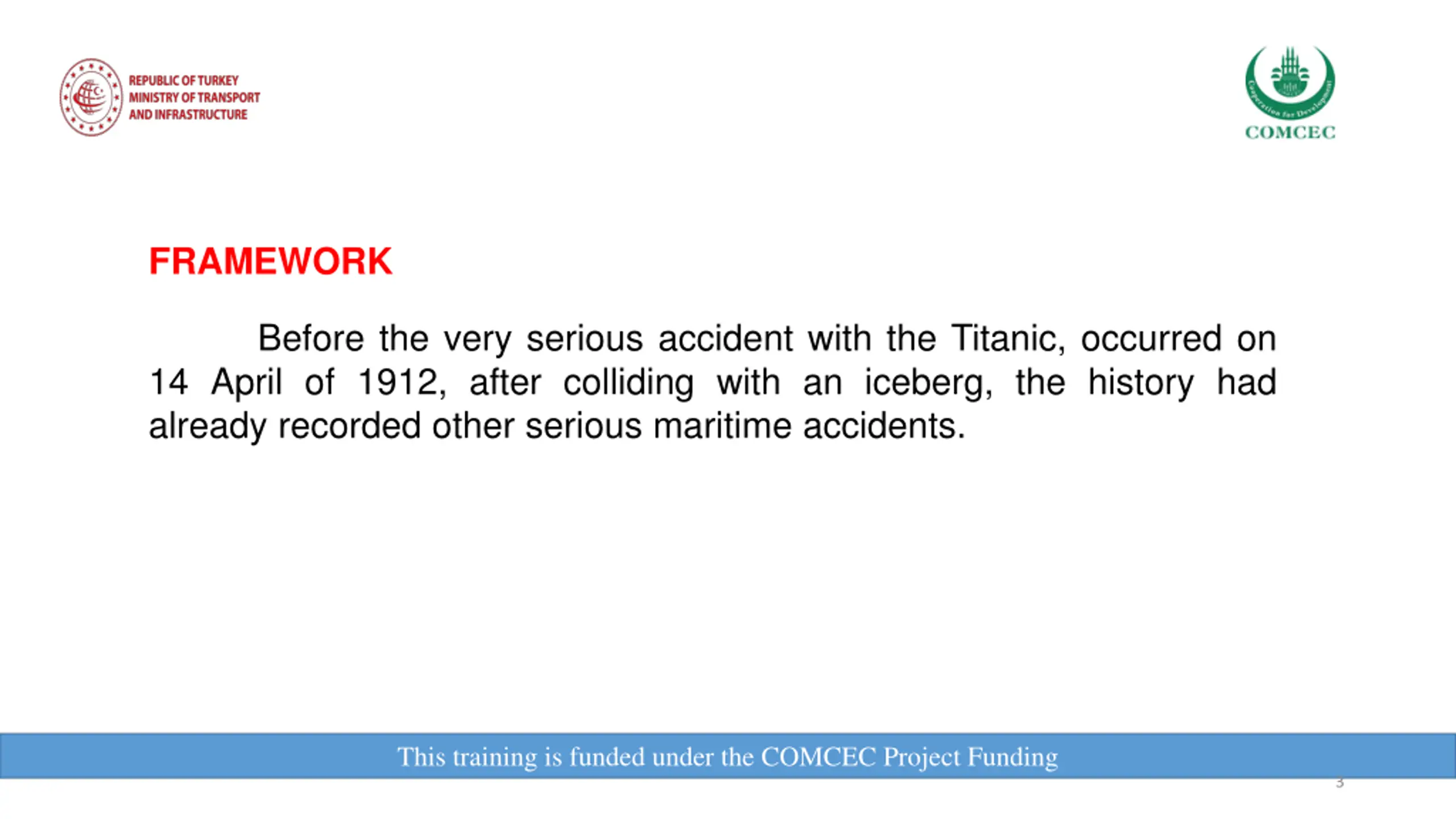 FRAMEWORK Before the very serious accident with the Titanic, occurred on 14 April of 1912, after colliding with an iceberg, the history had already recorded other serious maritime accidents. This training is funded under the COMCEC Project Funding 3