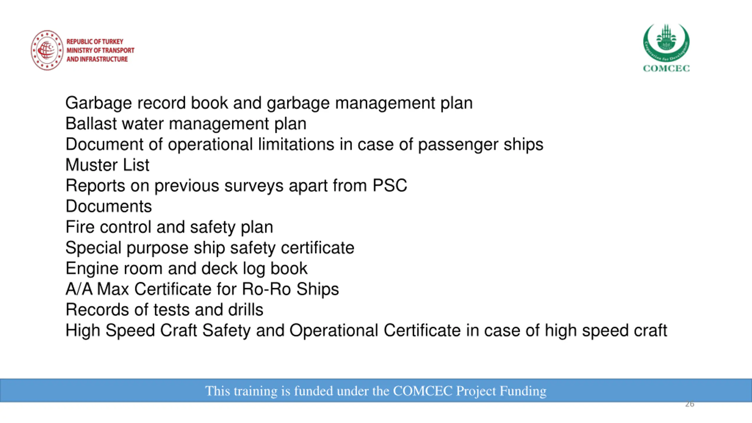 Garbage record book and garbage management plan Ballast water management plan Document of operational limitations in case of passenger ships Muster List Reports on previous surveys apart from PSC Documents Fire control and safety plan Special purpose ship safety certificate Engine room and deck log book A/A Max Certificate for Ro-Ro Ships Records of tests and drills High Speed Craft Safety and Operational Certificate in case of high speed craft This training is funded under the COMCEC Project Funding 26