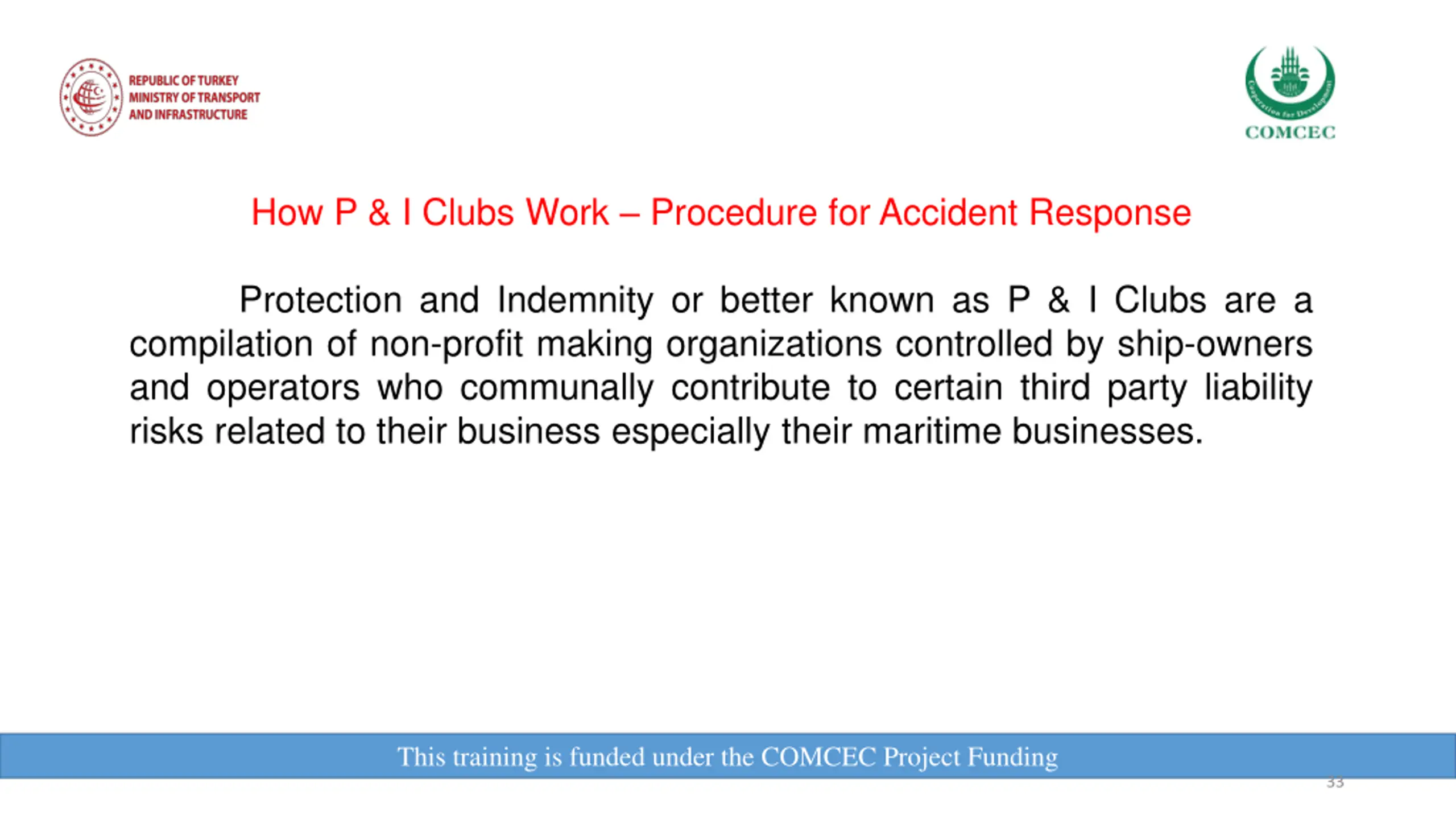 How P & I Clubs Work Procedure for Accident Response compilation of non-profit making organizations controlled by ship-owners and operators who communally contribute to certain third party liability risks related to their business especially their maritime businesses. Protection and Indemnity or better known as P & I Clubs are a This training is funded under the COMCEC Project Funding 33