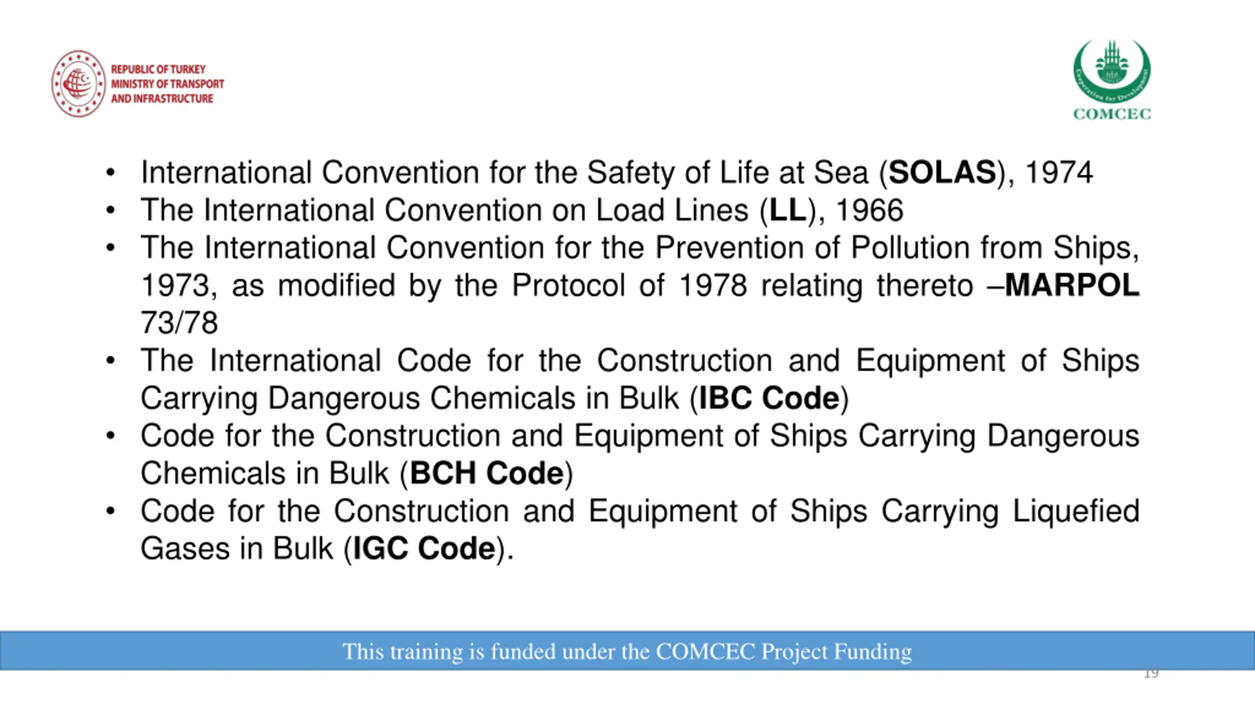 International Convention for the Safety of Life at Sea (SOLAS), 1974 The International Convention on Load Lines (LL), 1966 The International Convention for the Prevention of Pollution from Ships, 1973, as modified by the Protocol of 1978 relating thereto MARPOL 73/78 The International Code for the Construction and Equipment of Ships Carrying Dangerous Chemicals in Bulk (IBC Code) Code for the Construction and Equipment of Ships Carrying Dangerous Chemicals in Bulk (BCH Code) Code for the Construction and Equipment of Ships Carrying Liquefied Gases in Bulk (IGC Code). This training is funded under the COMCEC Project Funding 19