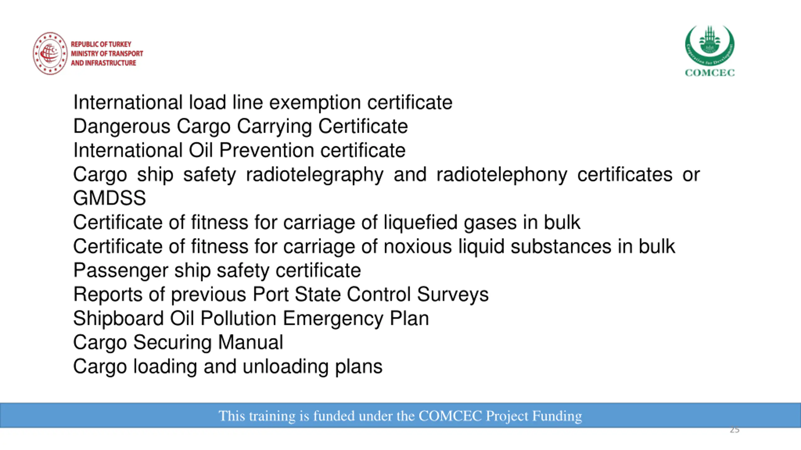 International load line exemption certificate Dangerous Cargo Carrying Certificate International Oil Prevention certificate Cargo ship safety radiotelegraphy and radiotelephony certificates or GMDSS Certificate of fitness for carriage of liquefied gases in bulk Certificate of fitness for carriage of noxious liquid substances in bulk Passenger ship safety certificate Reports of previous Port State Control Surveys Shipboard Oil Pollution Emergency Plan Cargo Securing Manual Cargo loading and unloading plans This training is funded under the COMCEC Project Funding 25
