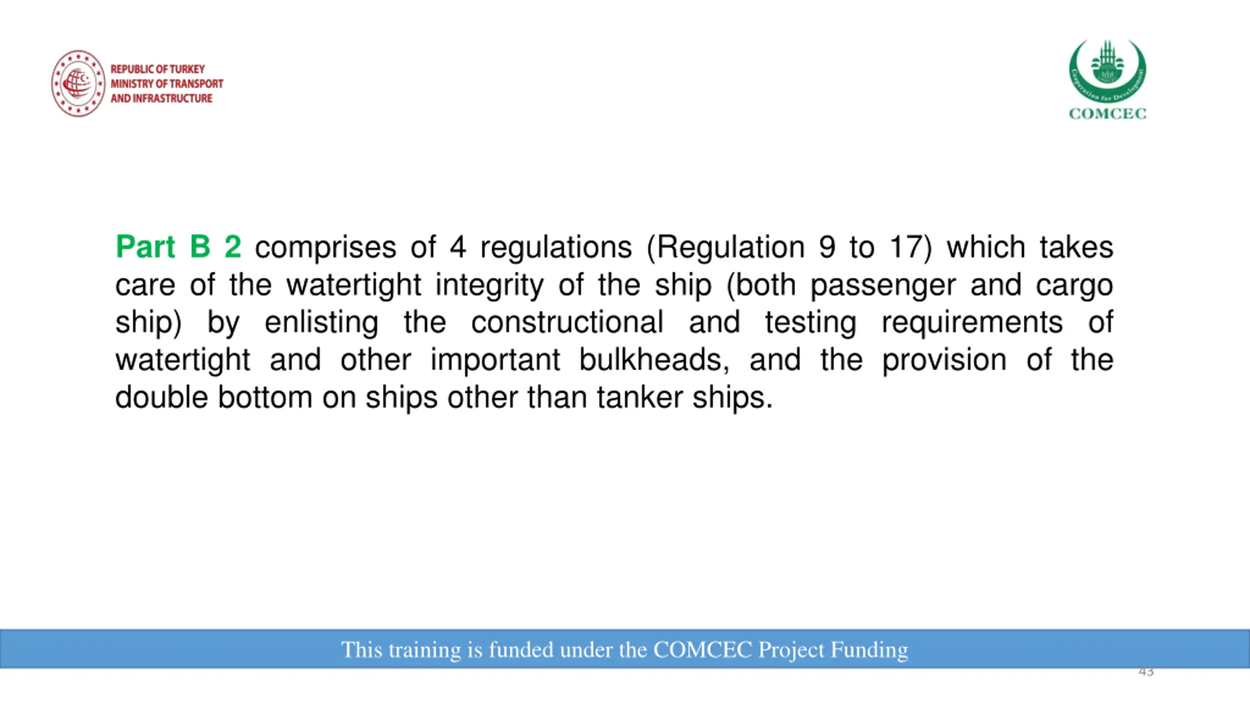 Part B 2 comprises of 4 regulations (Regulation 9 to 17) which takes care of the watertight integrity of the ship (both passenger and cargo ship) by enlisting the constructional and testing requirements of watertight and other important bulkheads, and the provision of the double bottom on ships other than tanker ships. This training is funded under the COMCEC Project Funding 43