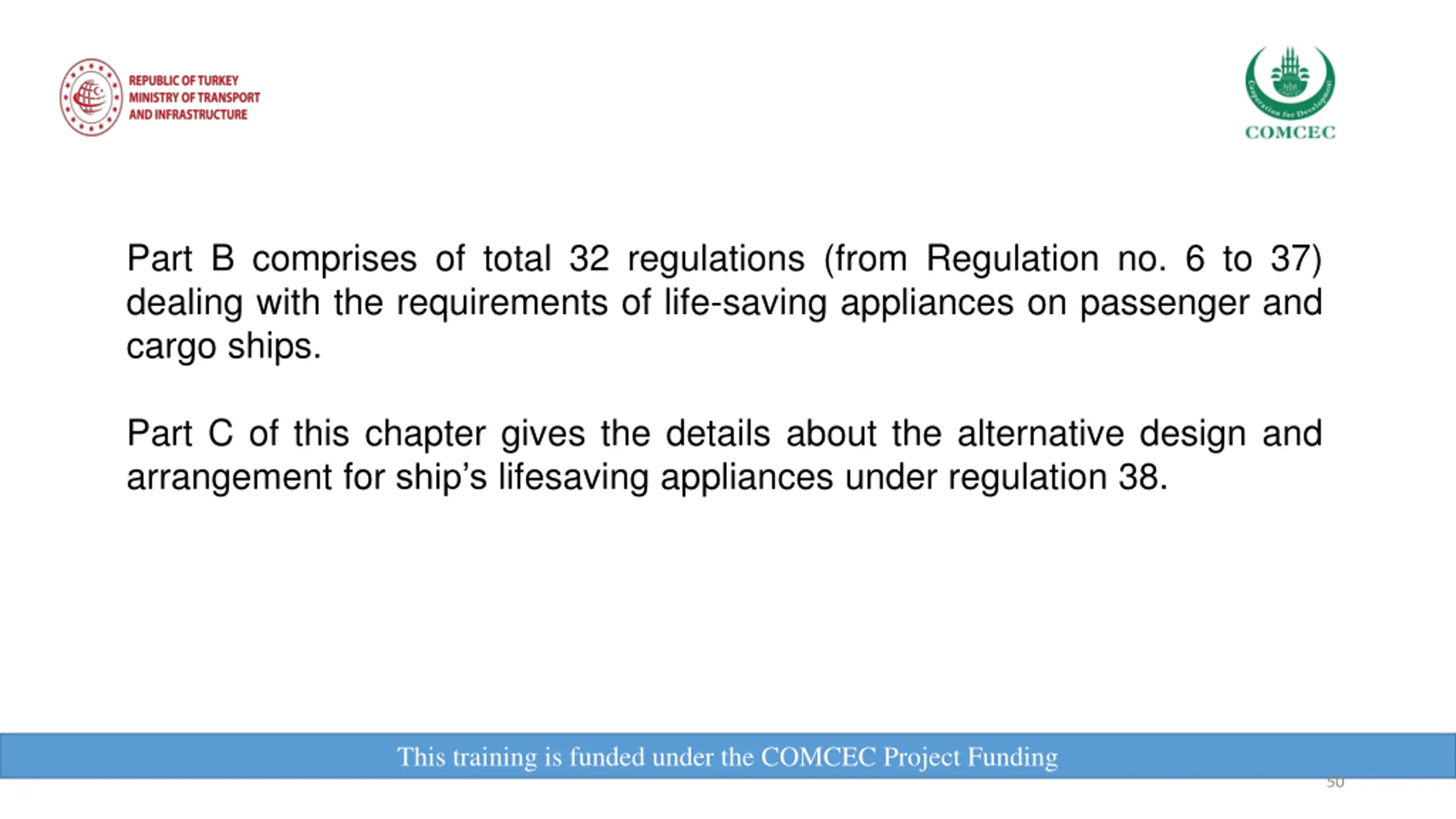 Part B comprises of total 32 regulations (from Regulation no. 6 to 37) dealing with the requirements of life-saving appliances on passenger and cargo ships. Part C of this chapter gives the details about the alternative design and arrangement for ship s lifesaving appliances under regulation 38. This training is funded under the COMCEC Project Funding 50