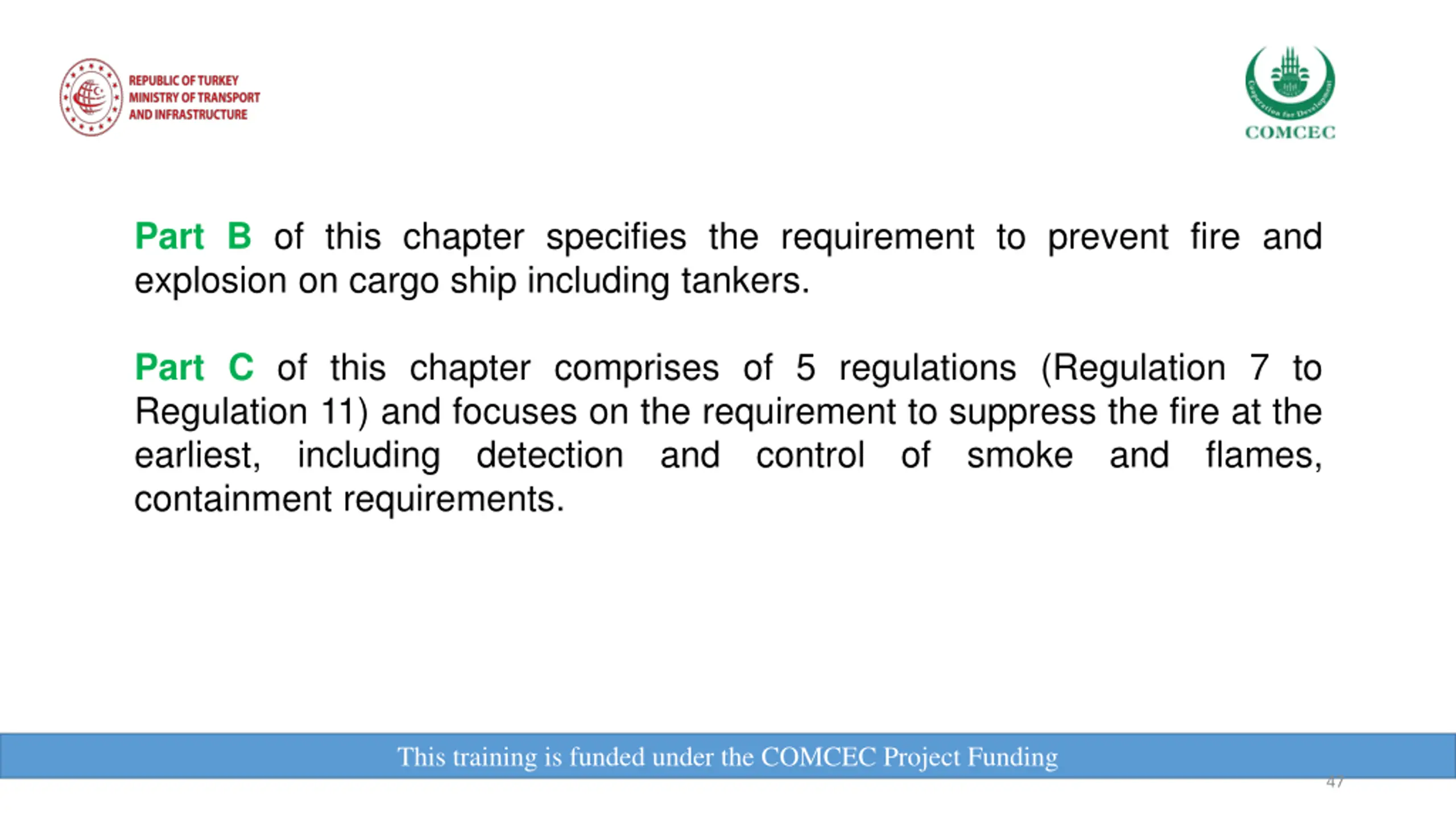 Part B of this chapter specifies the requirement to prevent fire and explosion on cargo ship including tankers. Part C of this chapter comprises of 5 regulations (Regulation 7 to Regulation 11) and focuses on the requirement to suppress the fire at the earliest, including detection and containment requirements. control of smoke and flames, This training is funded under the COMCEC Project Funding 47