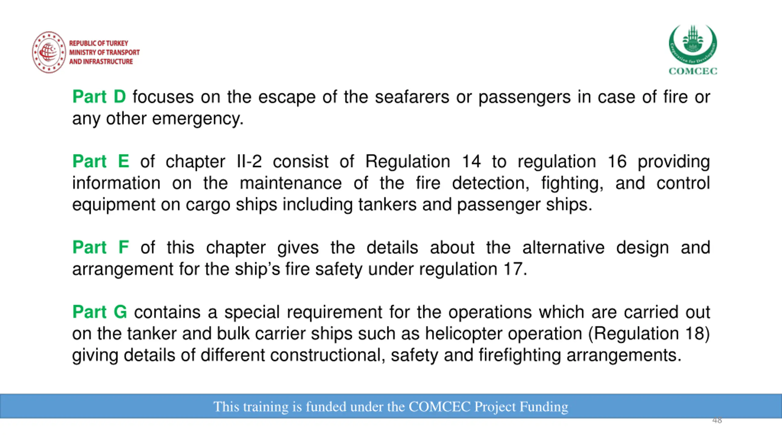 Part D focuses on the escape of the seafarers or passengers in case of fire or any other emergency. Part E of chapter II-2 consist of Regulation 14 to regulation 16 providing information on the maintenance of the fire detection, fighting, and control equipment on cargo ships including tankers and passenger ships. Part F of this chapter gives the details about the alternative design and arrangement for the ship s fire safety under regulation 17. Part G contains a special requirement for the operations which are carried out on the tanker and bulk carrier ships such as helicopter operation (Regulation 18) giving details of different constructional, safety and firefighting arrangements. This training is funded under the COMCEC Project Funding 48