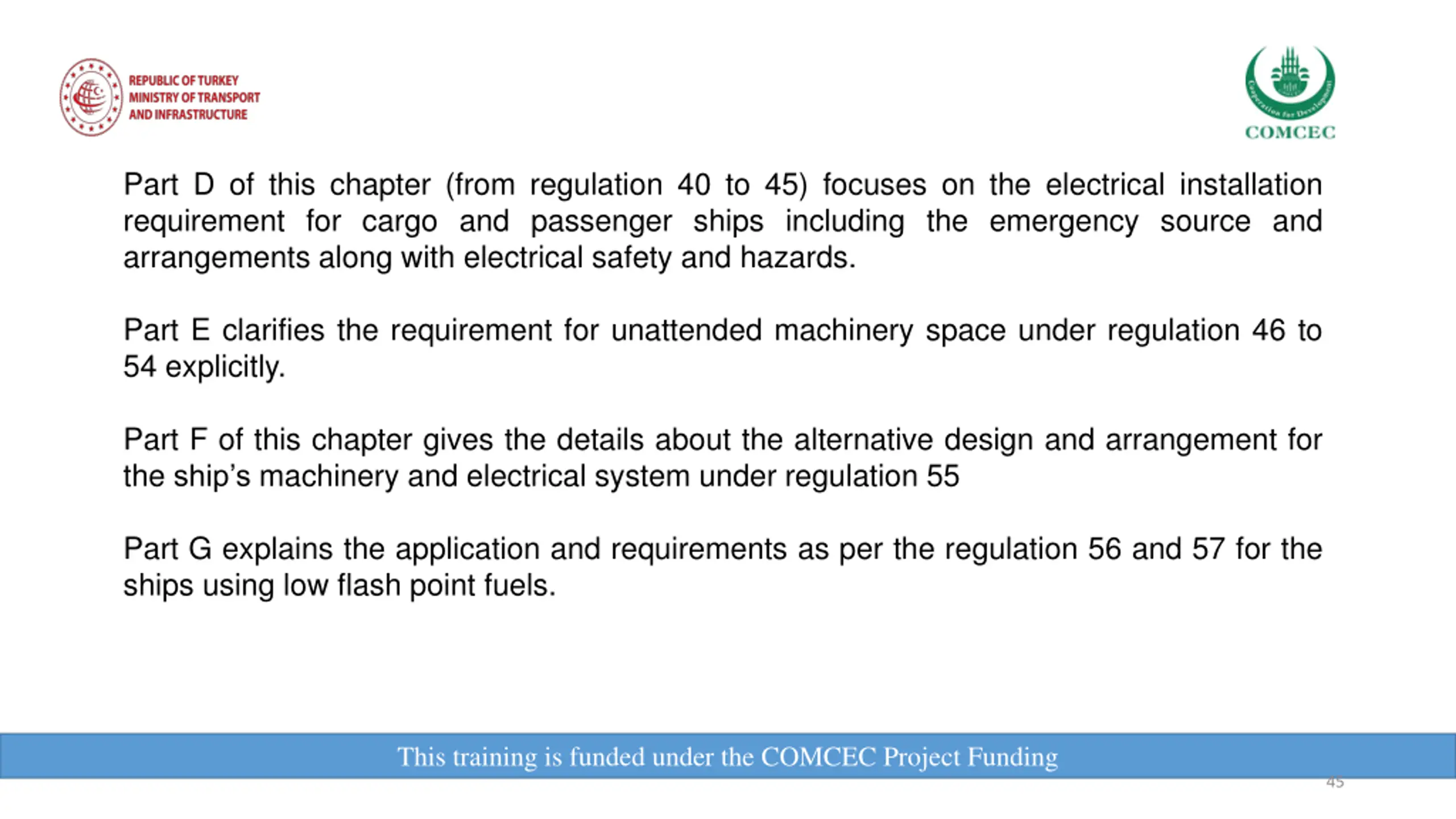 Part D of this chapter (from regulation 40 to 45) focuses on the electrical installation requirement for cargo and passenger ships including the emergency source and arrangements along with electrical safety and hazards. Part E clarifies the requirement for unattended machinery space under regulation 46 to 54 explicitly. Part F of this chapter gives the details about the alternative design and arrangement for the ship s machinery and electrical system under regulation 55 Part G explains the application and requirements as per the regulation 56 and 57 for the ships using low flash point fuels. This training is funded under the COMCEC Project Funding 45